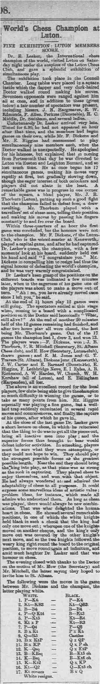 Courtesy of The British Newspaper Archive (Beds Advertiser and Luton Times Feb 21st 1908), I have unearthed evidence that the former world champion Dr. Emanuel Lasker performed a simul in my home town, his record being W13 D3 L1.