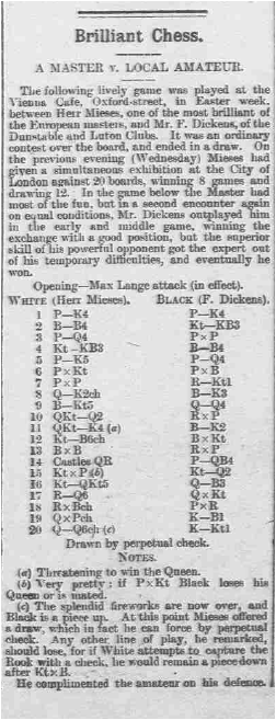 In case you thought that Dickens’s victory was something of a fluke, I have found a game where he draws with Jacques Mieses, a leading player of his day.
