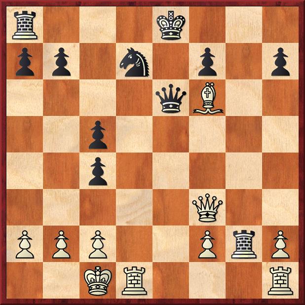 The position after 20…Kg8. Note that it is Mieses going for the draw. If you play through the game you will see that white misses a clear win with 16 Nb5. Better would have been Nxe6 Qxe6 with Qf3, after which the double threat of the pin on the queen and the rook en prise cannot be met (see below).