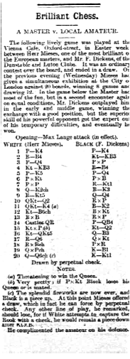 Those of us local, with an interest in our history know just how important author F.Dickens was. Did the man who trounced Lasker (albeit in a simul) and had Jacques Meises scrambling for a draw really learn how to play chess as an adult from a local farmer? I wonder if the comments reported above really are true? There is no word on who the reporter is and how he acquired such ‘information’.