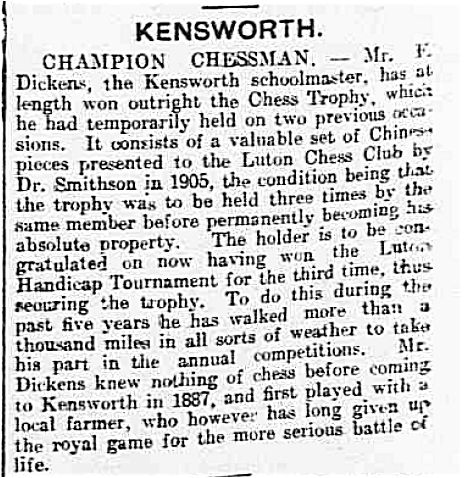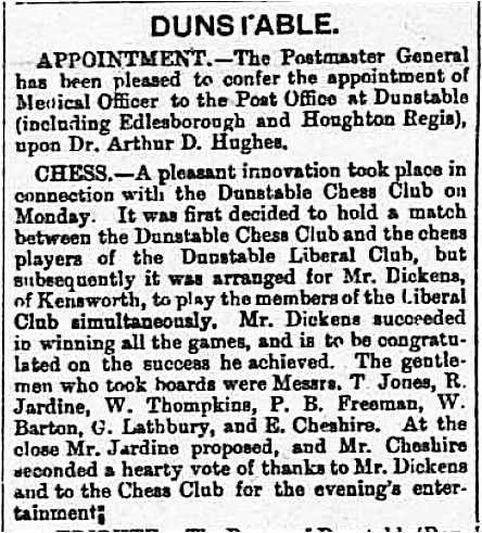 It should be noted that the Luton/Dunstable chess scene was exceptionally strong at that time, drawing in the world’s greatest players for simuls with ease on a regular basis, such as Blackburne the great simul master who was unable to beat F.Dickens. To go from a non-playing adult to top board in a blisteringly strong Luton side is possible but improbable unless you are exceptionally talented.