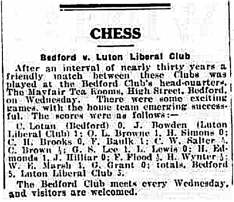 Some rather blasé journalism can be found in ‘A Chess Move’, which I feel gives an unfair account of the state of chess in Bedford at the time. If you’ve read ‘Chess in Bedfordshire’ (1933), you will most likely suspect that the author of ‘A Chess Move’ is following the book without performing adequate research. Please click on the images for a better view.