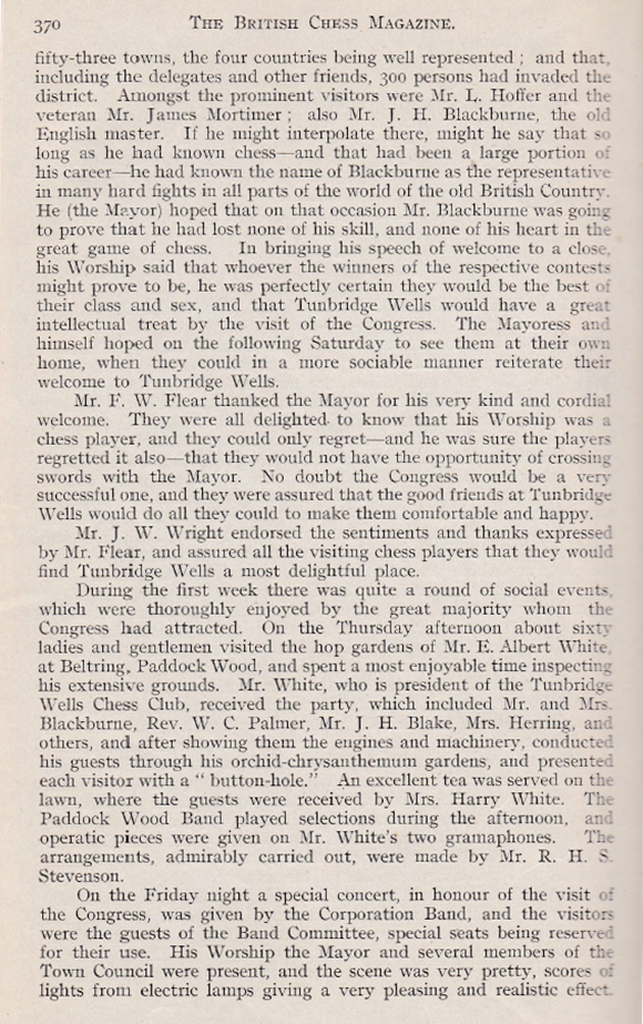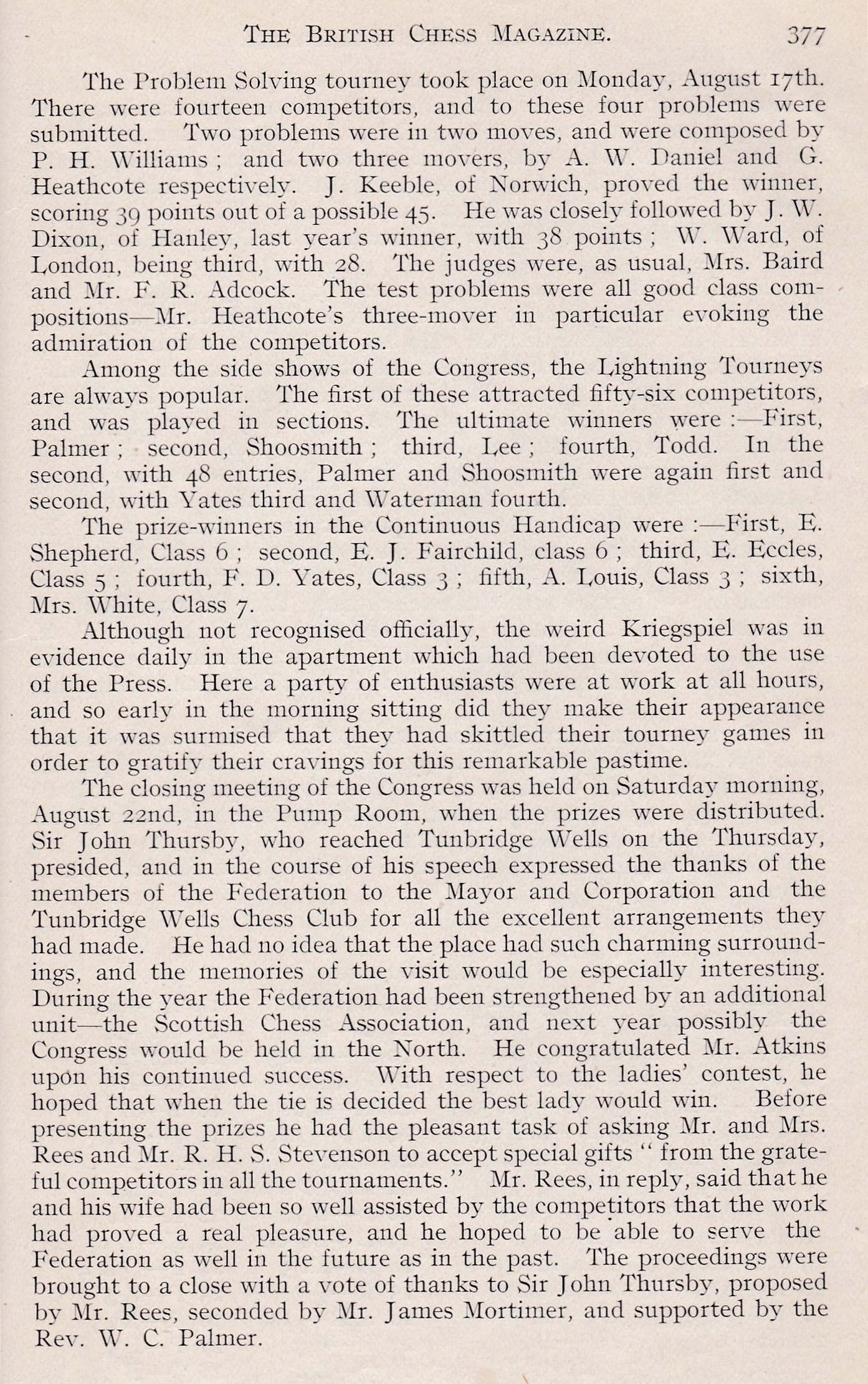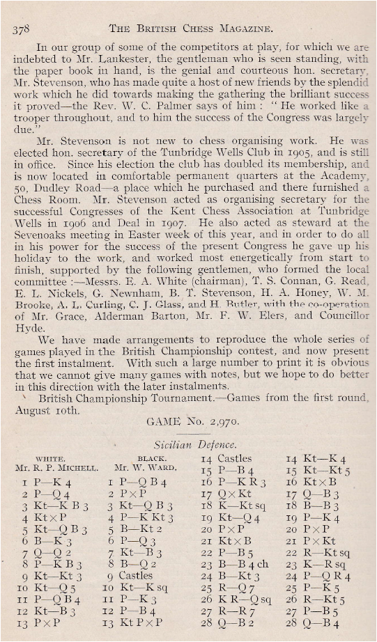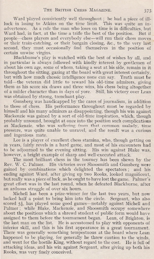 […] and 1908, during which he came second to H. E. Atkins on both occasions, then 3rd in 1909. See https://mccreadyandchess.com/2016/01/31/the-1908-british-chess-championship/ for an account of the 1908 British Championship and […]