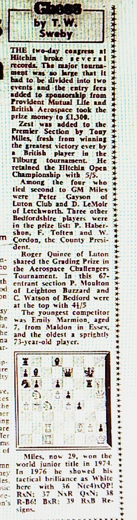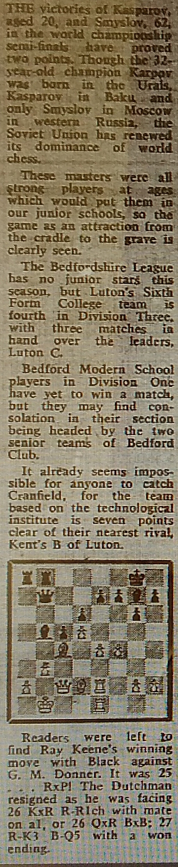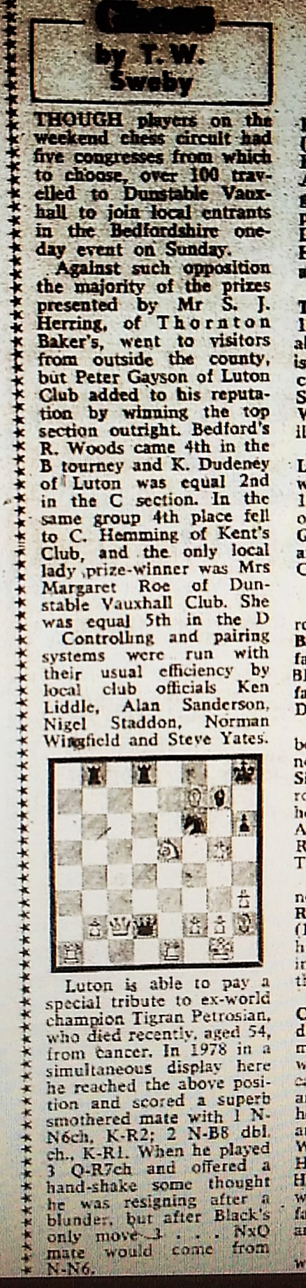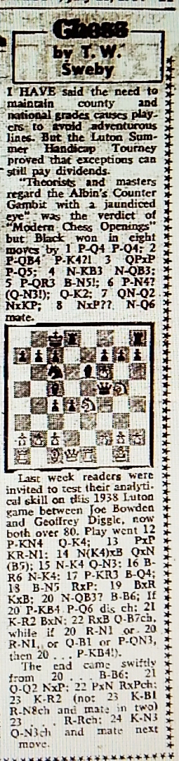 Not perhaps, but quintessentially, Old Tom Sweby is best thought of as a passionate devotee to the newspapers he wrote for. He was well read and knowledgeable of the Bedfordshire chess scene and well beyond, given that he was the president of the S.C.C.U. once upon a time. He was generally well-respected and rubbed shoulders with many, if not all, of those eminent within British chess circles. It would, however, be a critical mistake to see his column is primary source material entirely. That it is not. You will also find secondary source material quoted too, and the reliability of that is not quite as Tom hoped. Given that he wrote for decades, this is to some degree inevitable, and after all we are all prone to error whether we realize it or not. Thankfully, with regards to old Tom Sweby, they are infrequent and for the most part old Tom continued to document events and developments in the Bedfordshire league from the get go as best he could but, of course, everything lies open to interpretation. Despite this, and generally speaking. this does indeed make him informative and thus worth reading. Dare I say his columns constitute a narrative describing the latest developments, match reports and changing nature of the Beds league...he knew his audience and wrote according. This manifested itself over decades but brevity was always in play courtesy of the restictions imposed by writing a column. Should you wish to read a in instrumental figure of the Beds' league post WW2, you are quite welcome to peruse what has been posted here... . :-) I should, however, point out that as the decades wore on he gradually moved on away from narratives concerning the Bedfordshire league towards affairs both historical and international. The reasons for this are multifarous, old age was a predominante factor presumably, however, the bottom line is with regards to how the Bedfordshire chess scene developed post WW2: old Tom Sweby is your go to guy. He wrote more about chess in Bedforshire than anyone else did but given he was a Lutonian and writing for a Luton newspaper there is both bias and greater coverage of his hometown than the rest of the county.