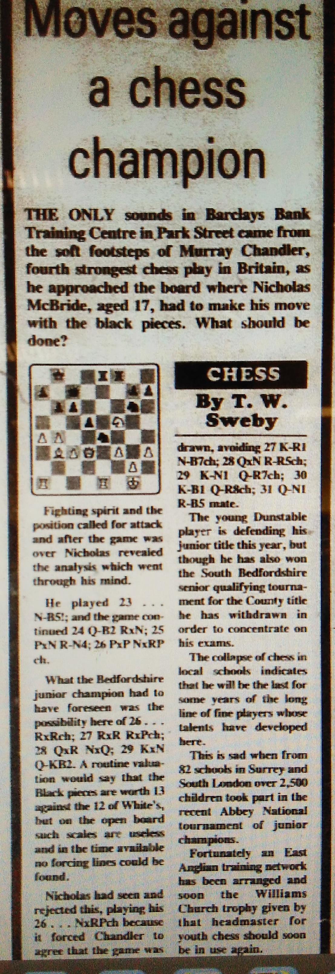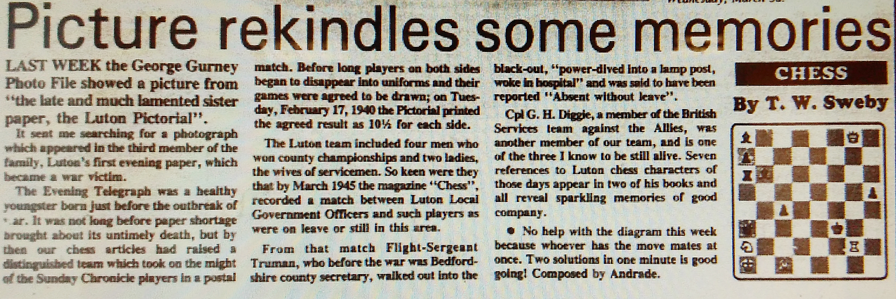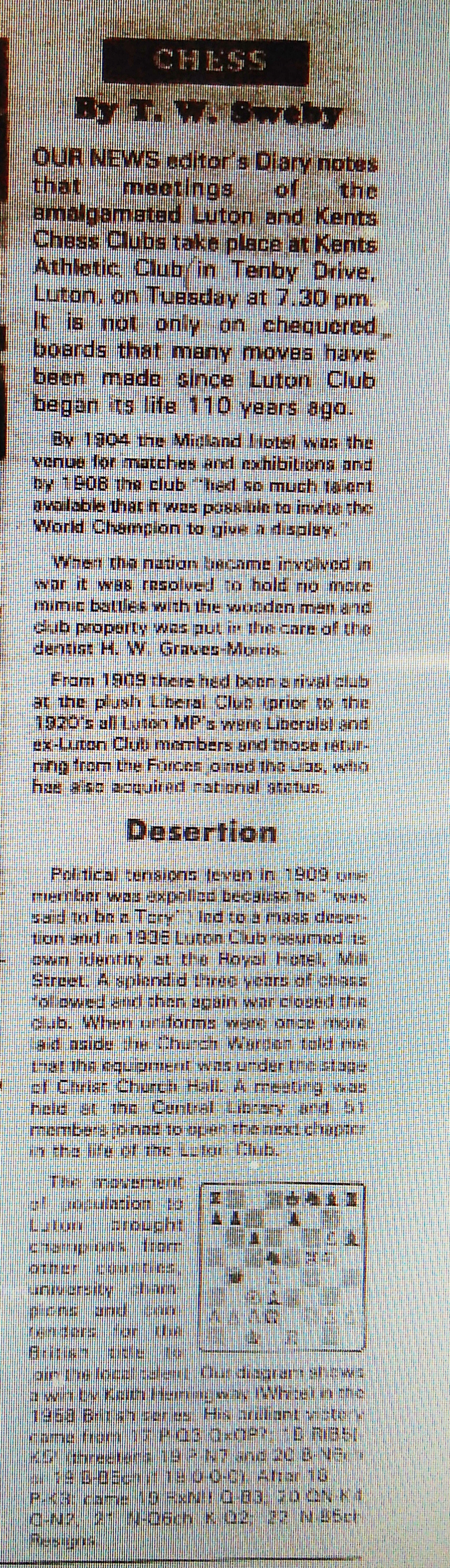 Not perhaps, but quintessentially, Old Tom Sweby is best thought of as a passionate devotee to the newspapers he wrote for. He was well read and knowledgeable of the Bedfordshire chess scene and well beyond, given that he was the president of the S.C.C.U. once upon a time. He was generally well-respected and rubbed shoulders with many, if not all, of those eminent within British chess circles. It would, however, be a critical mistake to see his column is primary source material entirely. That it is not. You will also find secondary source material quoted too, and the reliability of that is not quite as Tom hoped. Given that he wrote for decades, this is to some degree inevitable, and after all we are all prone to error whether we realize it or not. Thankfully, with regards to old Tom Sweby, they are infrequent and for the most part old Tom continued to document events and developments in the Bedfordshire league from the get go as best he could but, of course, everything lies open to interpretation. Despite this, and generally speaking. this does indeed make him informative and thus worth reading. Dare I say his columns constitute a narrative describing the latest developments, match reports and changing nature of the Beds league...he knew his audience and wrote according. This manifested itself over decades but brevity was always in play courtesy of the restictions imposed by writing a column. Should you wish to read a in instrumental figure of the Beds' league post WW2, you are quite welcome to peruse what has been posted here... . :-) I should, however, point out that as the decades wore on he gradually moved on away from narratives concerning the Bedfordshire league towards affairs both historical and international. The reasons for this are multifarous, old age was a predominante factor presumably, however, the bottom line is with regards to how the Bedfordshire chess scene developed post WW2: old Tom Sweby is your go to guy. He wrote more about chess in Bedforshire than anyone else did but given he was a Lutonian and writing for a Luton newspaper there is both bias and greater coverage of his hometown than the rest of the county.