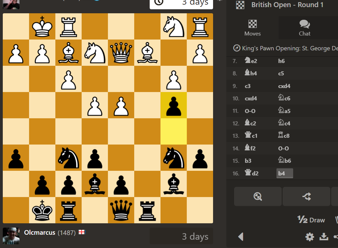 I’ve taken a penchant to the St. George’s Defence this year, although in truth it’s been brewing for some years now. Perhaps I shouldn’t post this but in the diagrams below my opponent has approached it correctly (but don’t ask me why he put has bishop on b3!). The 300+ games with it this year have taught me that the pawn chain f3, e4, and d4 is a tough nut to crack, and compounds the rather passive nature of the opening, forcing play upon the flank…oh and btw, I don’t like to say such things but you might want to forego the only publication on The St.George’s Defence for the title is misleading, as it isn’t primarily a book about The St.George’s Defence.
