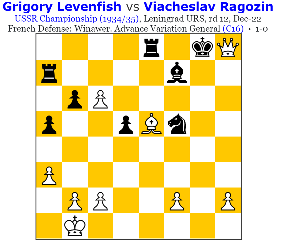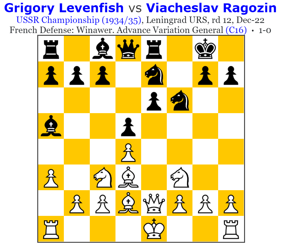 It could be argued that the Soviets played much more attacking chess then their, comparatively affluent, counterparts in the west. Partly because of what is ingrained in their culture/spirit, and partly because winning meant more or at least in becoming titled the government made more effort to look after you, and partly because the competition was much stiffer. And here’s a fine example from the 9th Soviet Championships, a spirited Levenfish shows us how it was done.