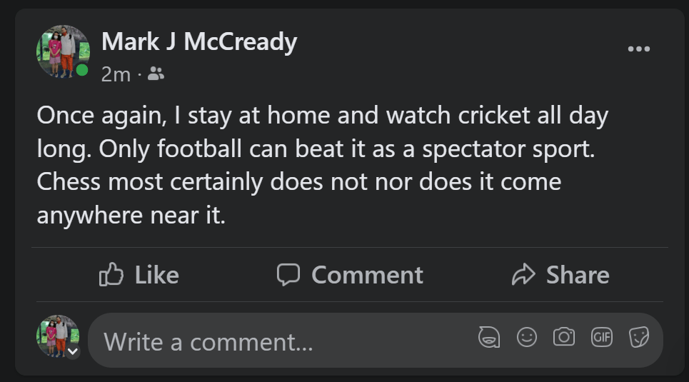 …I like to be both creative and amusing when I can be, factor in that playfulness has been an ever-present factor, the content of this site should be thought of as multifarious. It could be said I continue to enjoy undermining the conservatism I believe chess is underpinned by even after all these years, and often try to use humour to do it still, believing I have got better at it. Consequently, despite the general direction its going in, this site cannot only be about Chess in Bedfordshire and nor will it be. It may become noted for that yes -in fact that’s been the case for years already even by established historians, archivists, and whoever else. External factors aside, this site is titled McCreadyandChess. I cannot, nor will I not, remove my own personal thoughts and experiences of chess from the posts of this site -especially if I think they are funny or original for they constitute my writing at its very, very best. In addition, the number of categories alone tells you that breadth of content is important to me. I am proud of my site, it is identity conferring and that is how it shall stay -end of story. All you really have are: ‘Some thoughts on the beautiful game’, which, incidentally, just happen to be my very own; nothing more, nothing less, take of it whatever you please… .