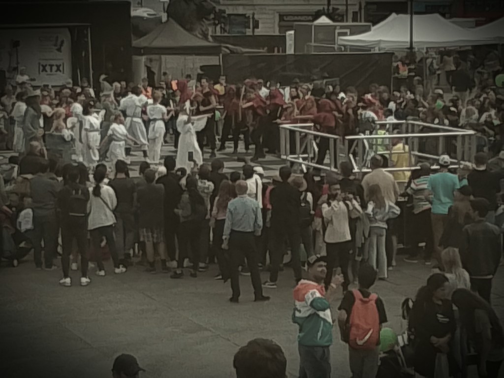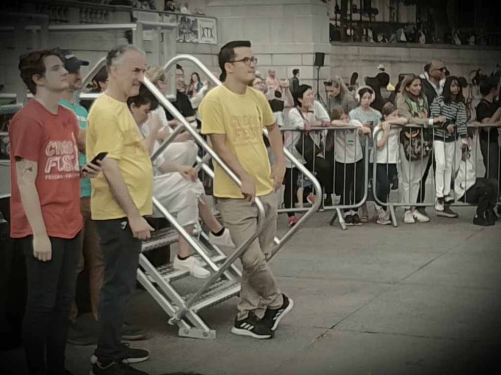 After the third set in the tennis, live chess was played in the square. I took an interest as seeing it was a first but I didn’t really like how it was done, so my interest didn’t last long. In the first game the play was paused as a quiz question was asked; namely, what is the name of the opening being played. It was I who answered correctly and enabled play to continue (The Sicilian Defence)… .
