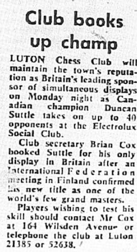 Peter kindly answered with the following: Dad (George Gayson, 1928-1999) was a fridge paint sprayer at Electrolux, who worked there from the late 50s up to retirement. He started the club in 1972. Attendance was pretty good in the early days, with around 40-50 members, but gradually tailed off, and the club folded around 1978-1979. Play was in the Electrolux recreation club, run by Luton FC’s Billy Waugh ( he once introduced me to Joe Payne, one of the club’s famous players, who also worked at Electrolux). I believe the club once hosted a simul by Canadian GM Duncan Suttles, possibly arranged by Brian Cox. After the club folded, I joined Luton chess club, back when it was in the church hall in Bury Park.