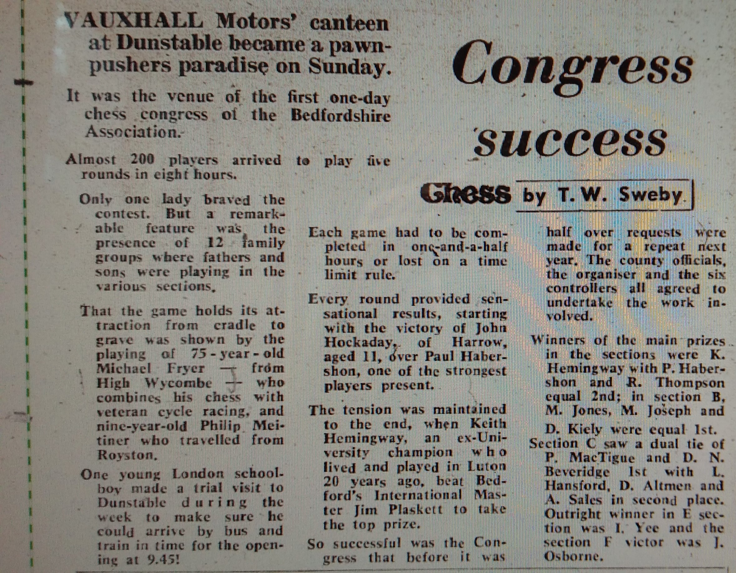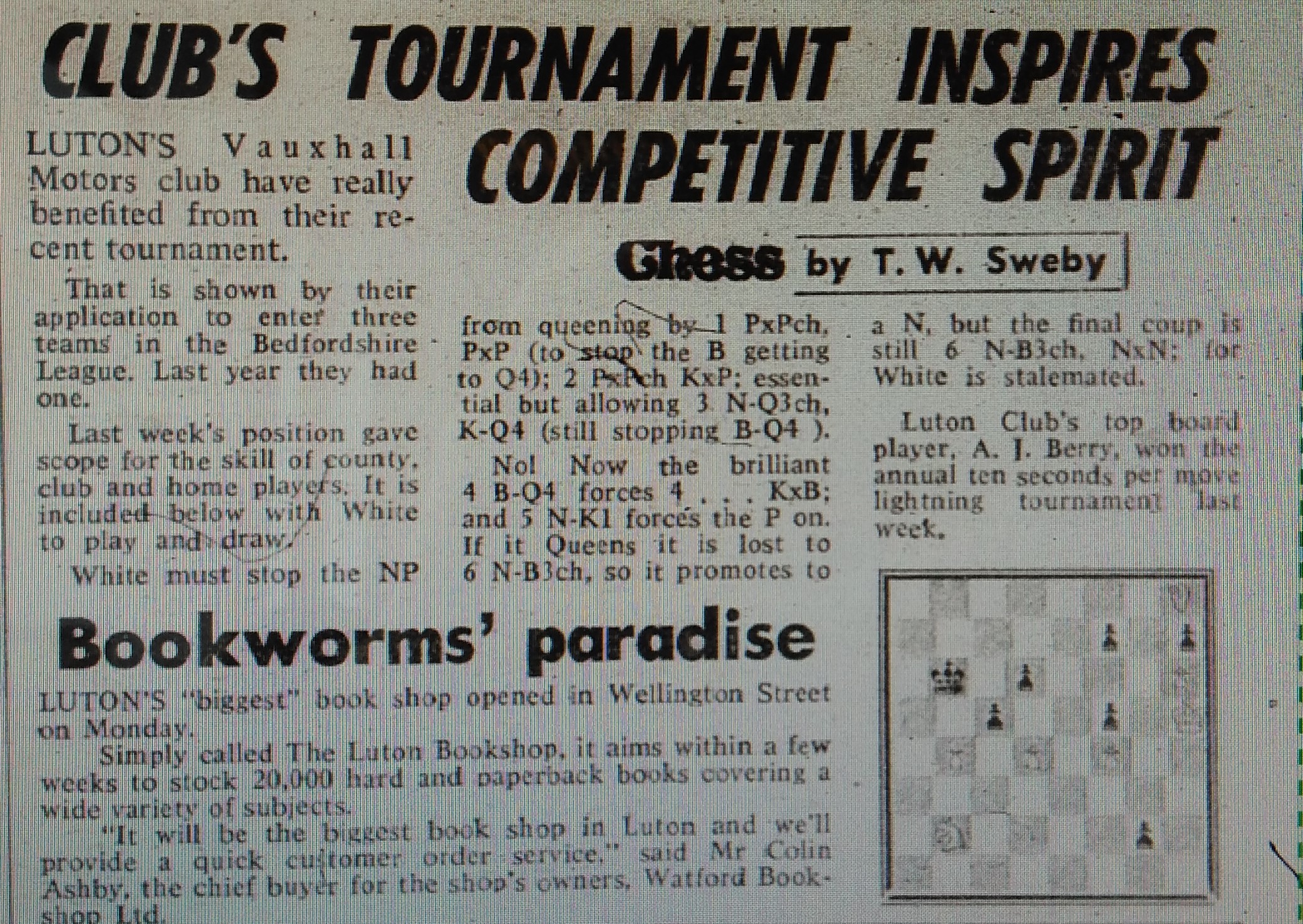 As a young chess player, stories about Luton chess club and the Bedfordshire league were told and retold many times over the years by various club members, as you might expect. But I distinctly remember the man who beat me in the final of the 92 Luton Chess Championship once told me that ‘Luton used to have its own league once!’ whilst we drove in the dark along country lanes to another club match together. What records have survived do not show this to be true but then not all divisions in the Bedfordshire league were published in The Luton News by Tom Sweby on a yearly basis -and that is the only primary source material in play here. What Grandmaster slayer Mr. P. Montgomery may have meant instead as he drove, I think, was in the wake of the commonly described ‘The English Chess Explosion’ following the Fischer – Spassky match, Luton dominated the Bedfordshire league in terms of registered clubs, and also had enough teams to create its own league -of this there is no doubt. There were working men’s clubs for the employees of the parent company, long before the so called ‘English Chess Explosion’ but when chess started booming thereafter they flourished and all were able to field teams in the league, sometimes more than one. Vauxhall, which was reported in the local news as early as 1937 (please see https://mccreadyandchess.wordpress.com/2015/06/05/bedfordshire-chess-in-the-70s-its-past-and-its-future/ for proof) had three teams at one point (no prizes given for correctly guessing which player, who went on to play for both Luton & Kent’s/Luton years later on, once brought his electric guitar to Vauxhall chess club and began playing it whilst games commenced, only to be taken outside and get beaten up in the snow by Dave Considine [also former Kents/Luton player, rated around 140-150]!). (Clue provided here in point 3: https://mccreadyandchess.wordpress.com/2013/01/11/fond-memories-of-bedfordshire-chess/)