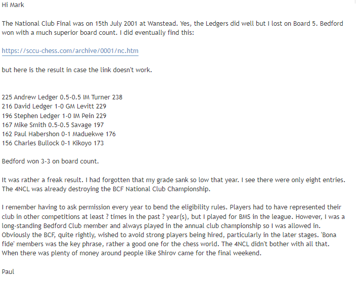 In addition, I am once again indebted to Mr. Paul Habershon, long standing member of Bedford Chess Club for his first hand account of the match. The text below is his response to my query.