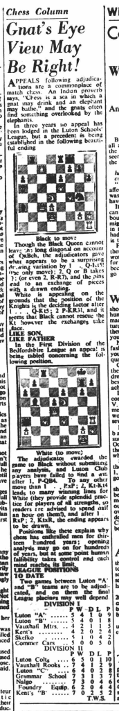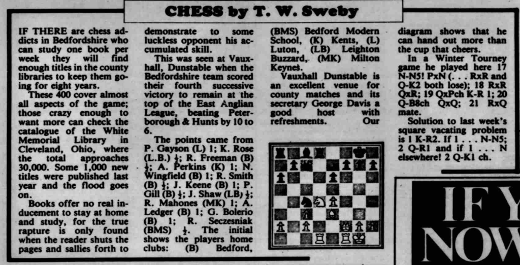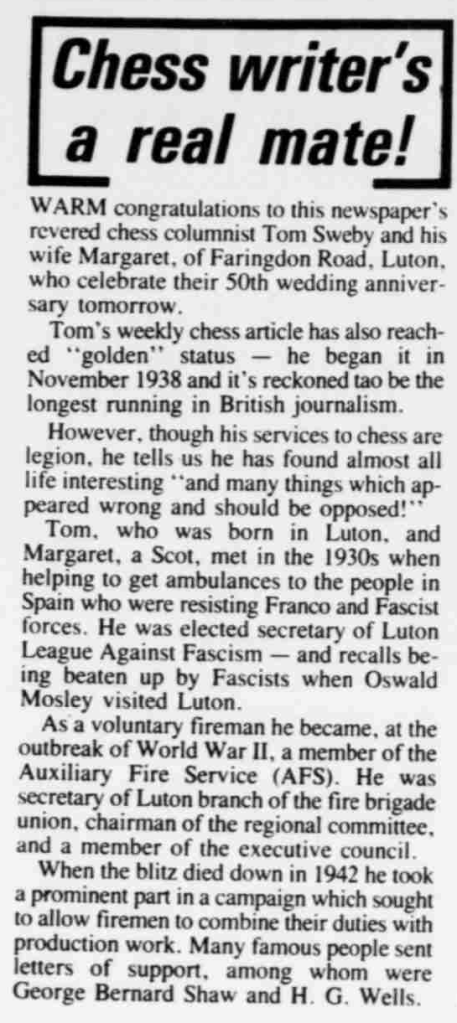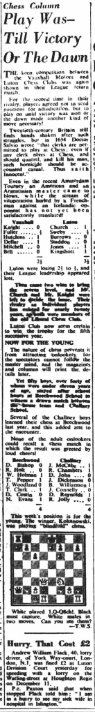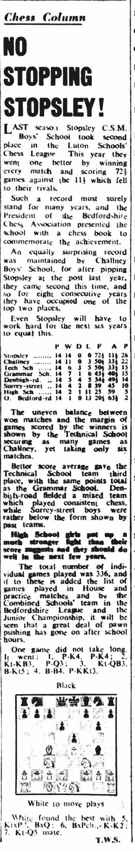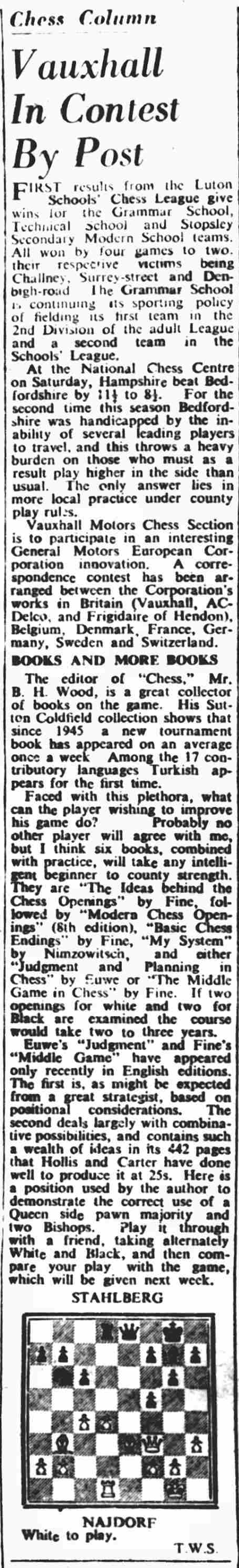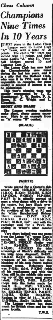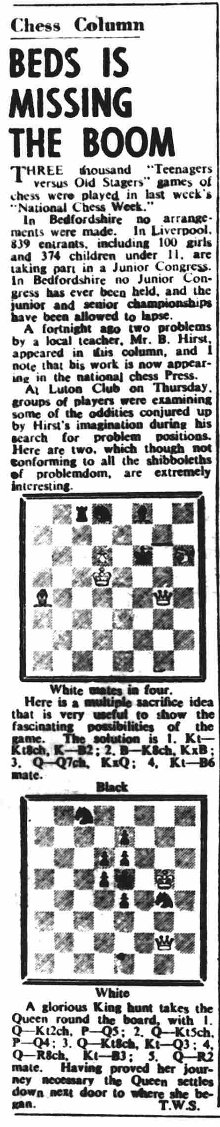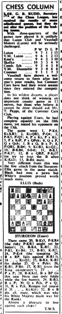 Tom Sweby, once described as a ‘tame communist by a former pupil who went on to put pen to paper also, is perhaps best known for his column in The Luton News, which ran for decades and was quite readable. That began in 67, but prior to that he also wrote for them and other newspapers on a freelance basis too. Not only that, he had a column in The Beds and Herts Pictorial which predated that in The Luton News. They are more or less the same and vary content both local and international, and both exude that lack of attention to detail he too frequently fell foul of. As far as I know, I am the only one who reproduces his columns and with this it is hoped that a greater appreciation and understanding of chess in the 50s in Bedfordshire will emerge. It must be said that chess wise the 50’s isn’t a decade which exemplifies strength and depth in Bedfordshire. This view is based on club and county results which were reported, the team members also indicate that the clubs in our league were not terribly strong back then.