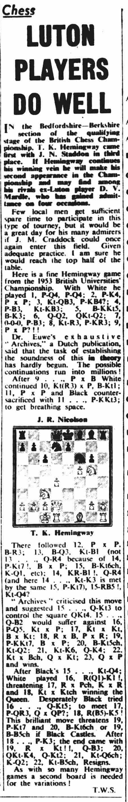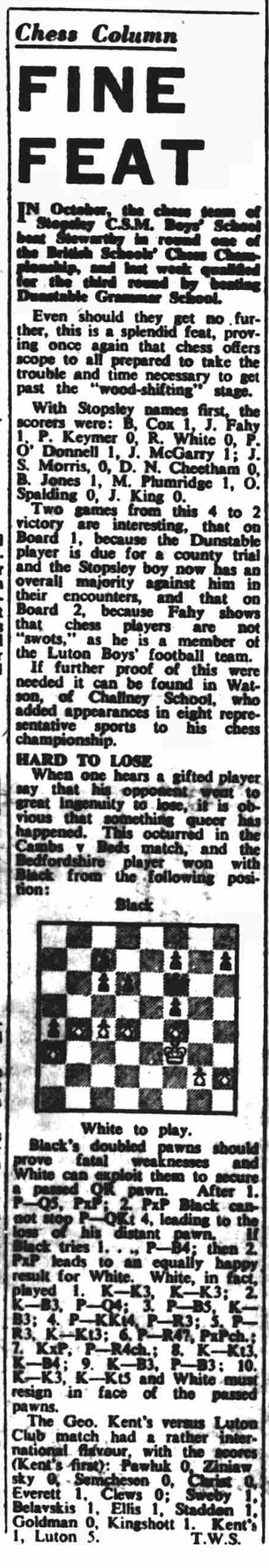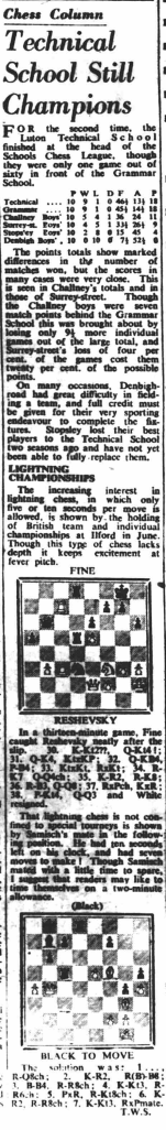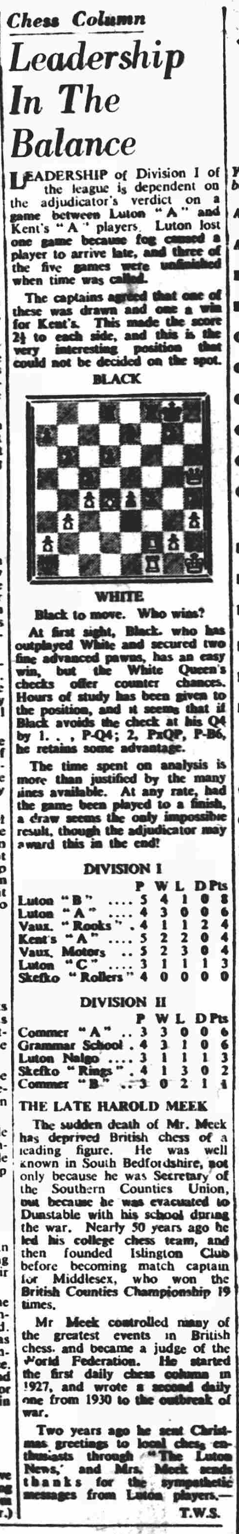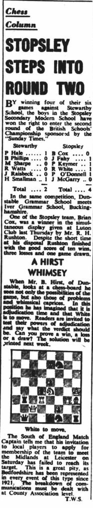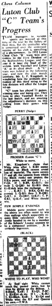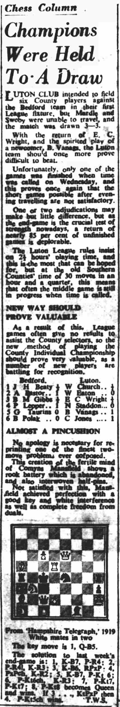 Tom Sweby, once described as a ‘tame communist by a former pupil who went on to put pen to paper also, is perhaps best known for his column in The Luton News, which ran for decades and was quite readable. That began in 67, but prior to that he also wrote for them and other newspapers on a freelance basis too. Not only that, he had a column in The Beds and Herts Pictorial which predated that in The Luton News. They are more or less the same and vary content both local and international, and both exude that lack of attention to detail he too frequently fell foul of. As far as I know, I am the only one who reproduces his columns and with this it is hoped that a greater appreciation and understanding of chess in the 50s in Bedfordshire will emerge. It must be said that chess wise the 50’s isn’t a decade which exemplifies strength and depth in Bedfordshire. This view is based on club and county results which were reported, the team members also indicate that the clubs in our league were not terribly strong back then.