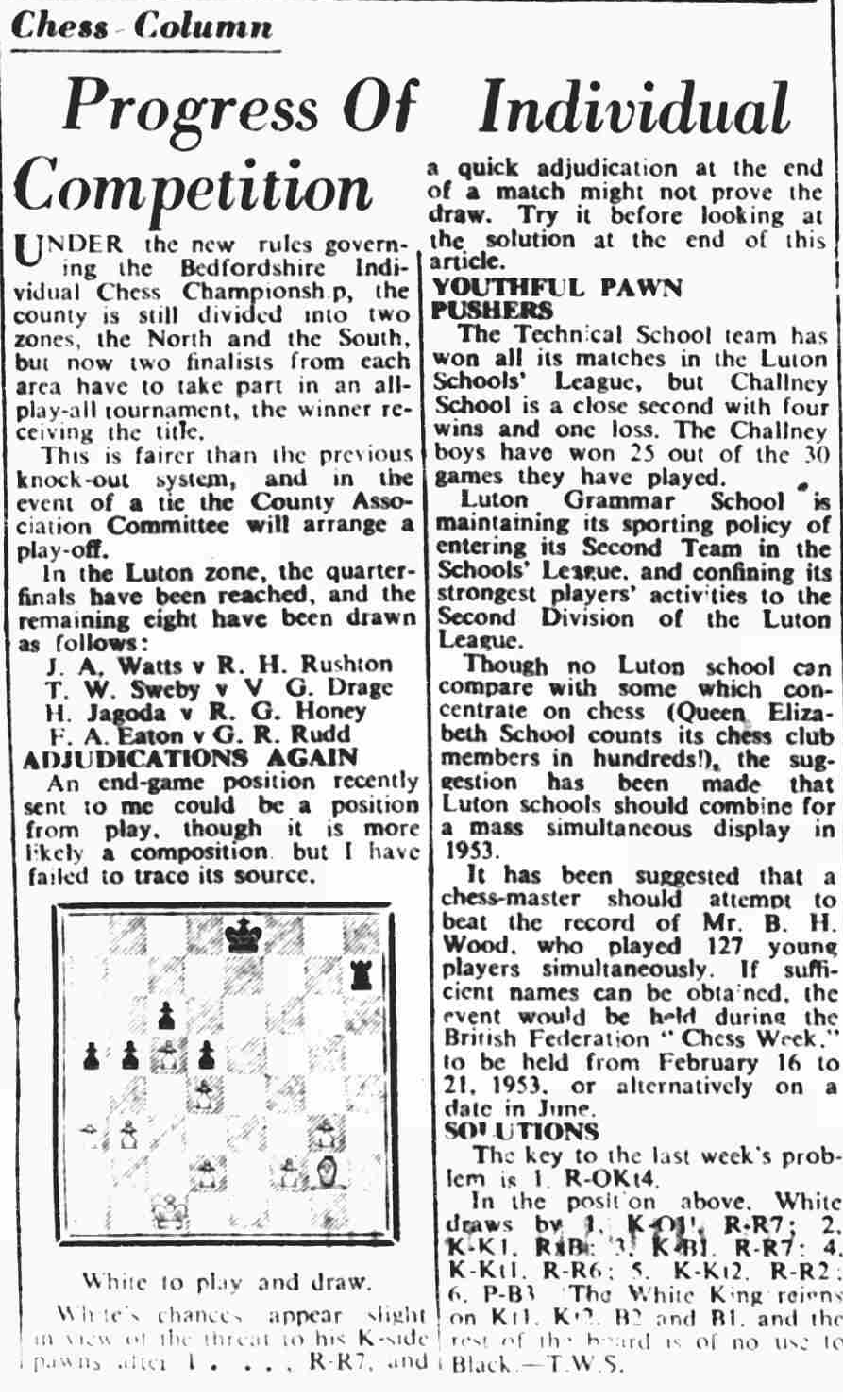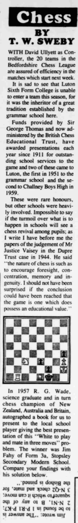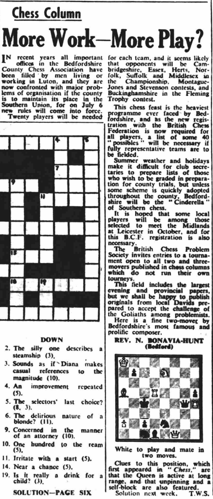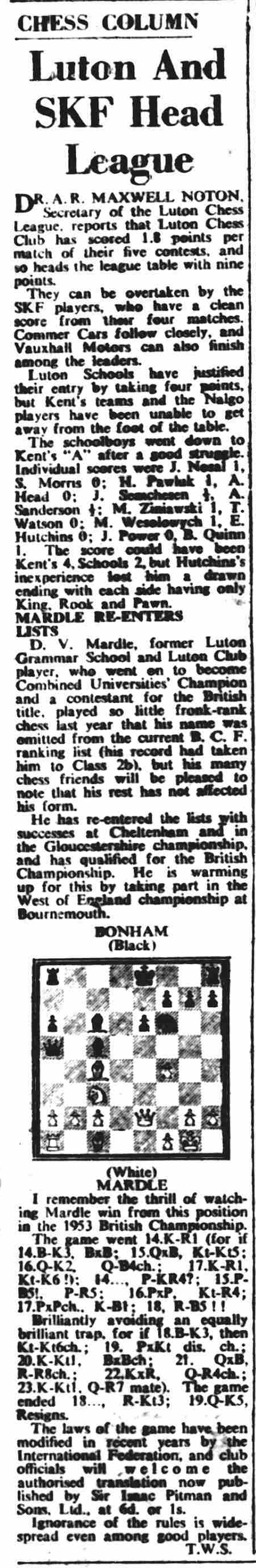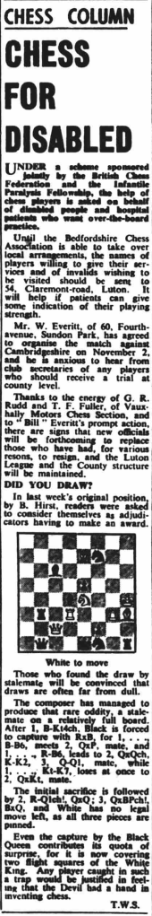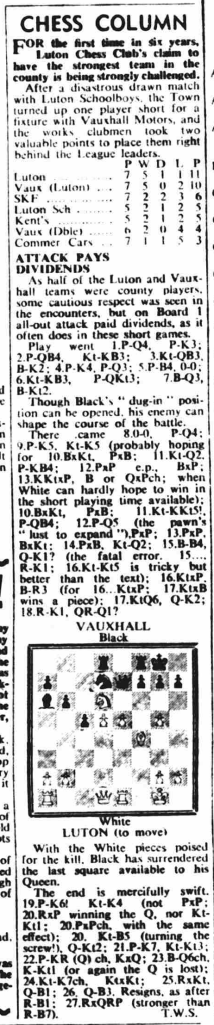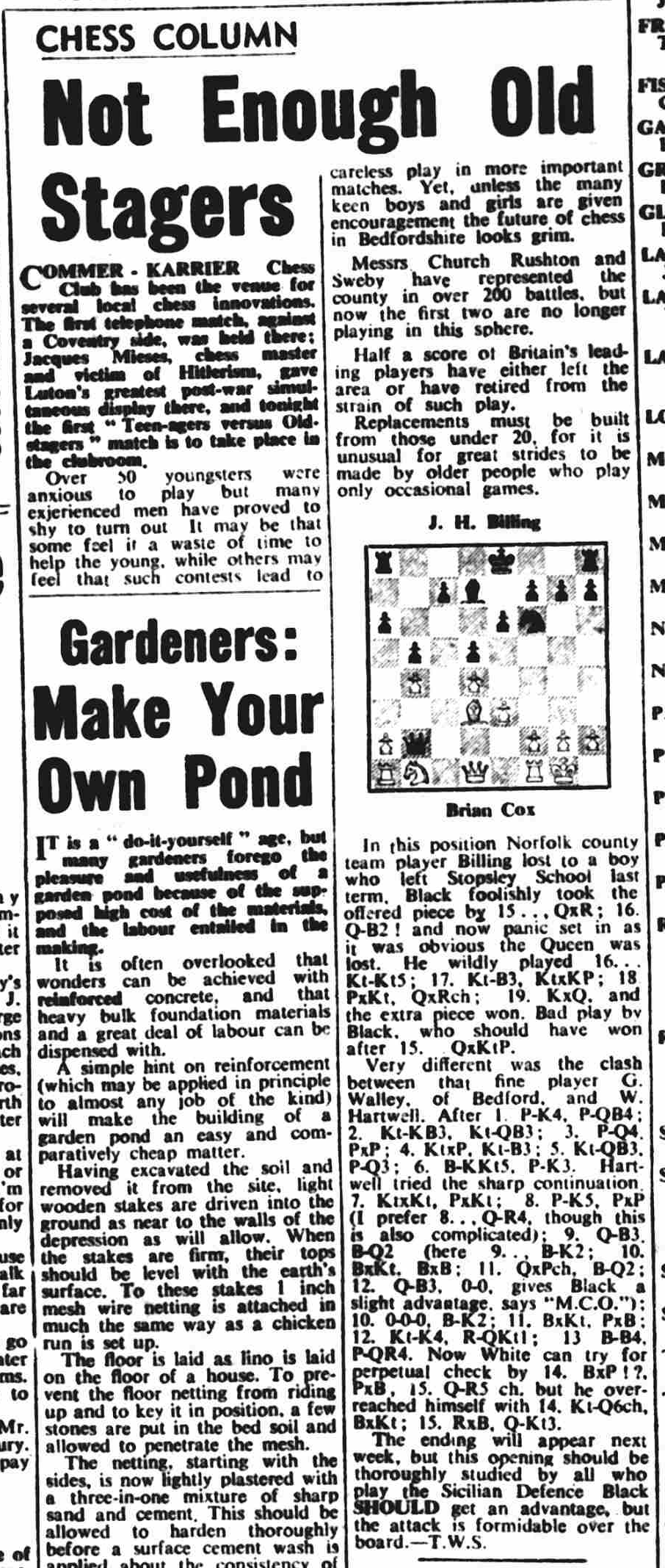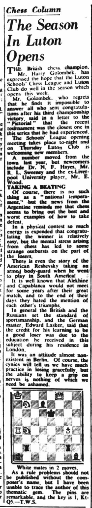 Tom Sweby, once described as a ‘tame communist by a former pupil who went on to put pen to paper also, is perhaps best known for his column in The Luton News, which ran for decades and was quite readable. That began in 67, but prior to that he also wrote for them and other newspapers on a freelance basis too. Not only that, he had a column in The Beds and Herts Pictorial which predated that in The Luton News. They are more or less the same and vary content both local and international, and both exude that lack of attention to detail he too frequently fell foul of. As far as I know, I am the only one who reproduces his columns and with this it is hoped that a greater appreciation and understanding of chess in the 50s in Bedfordshire will emerge. It must be said that chess wise the 50’s isn’t a decade which exemplifies strength and depth in Bedfordshire. This view is based on club and county results which were reported, the team members also indicate that the clubs in our league were not terribly strong back then.