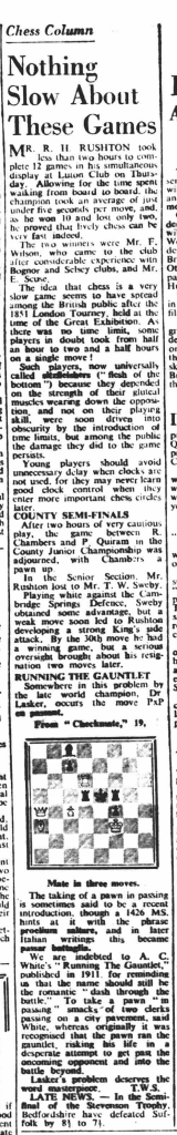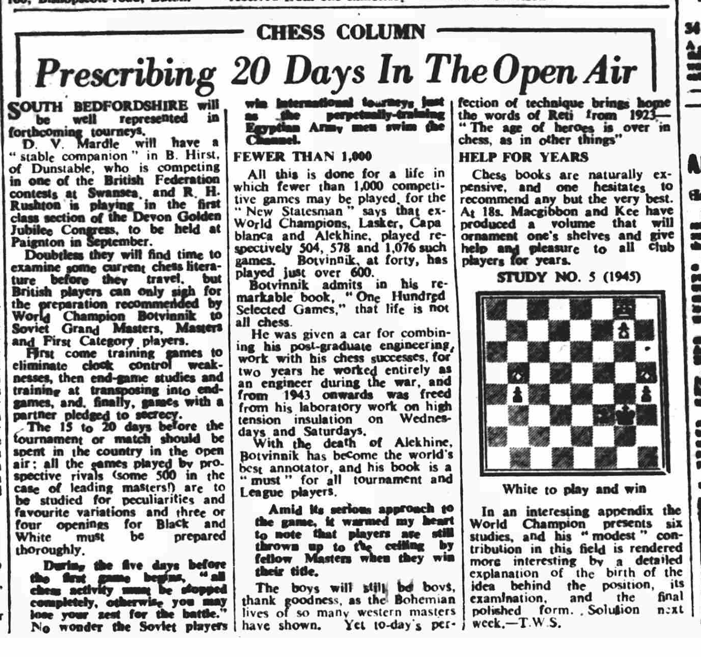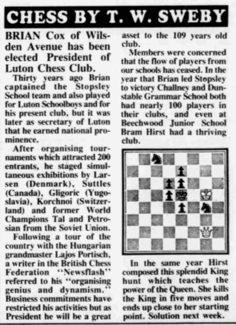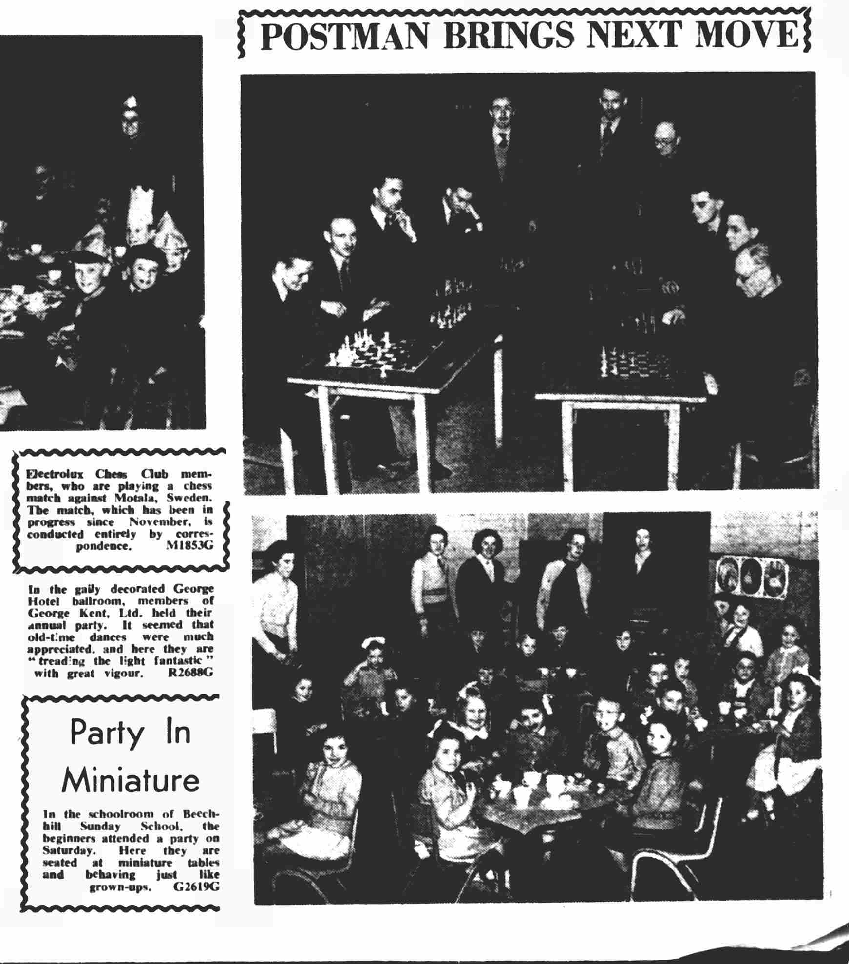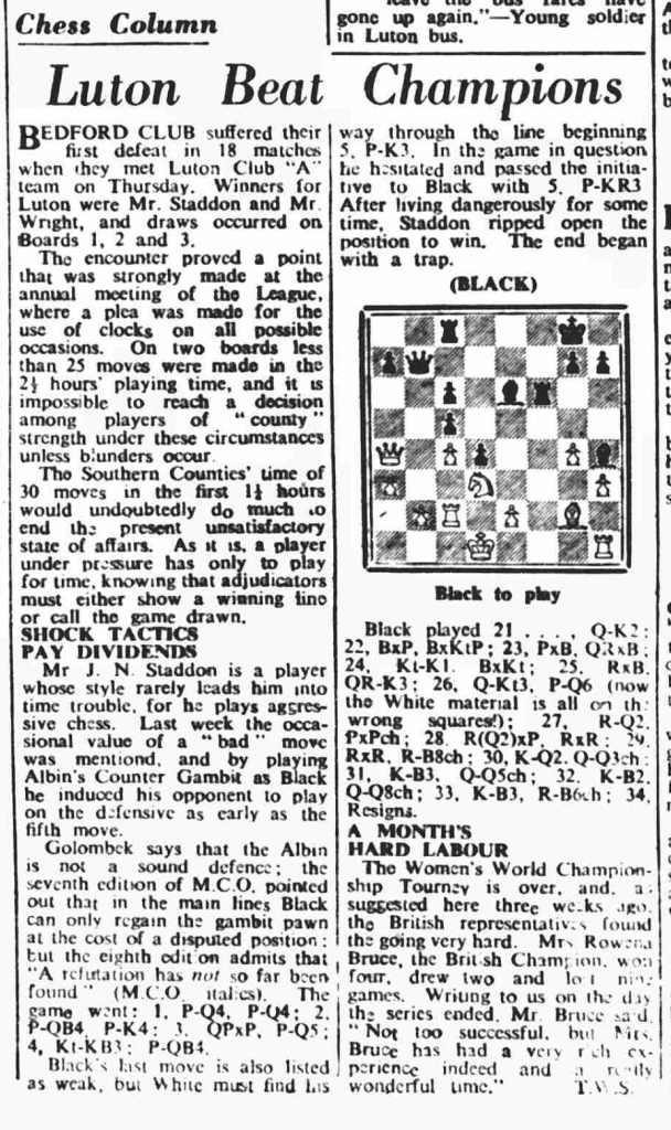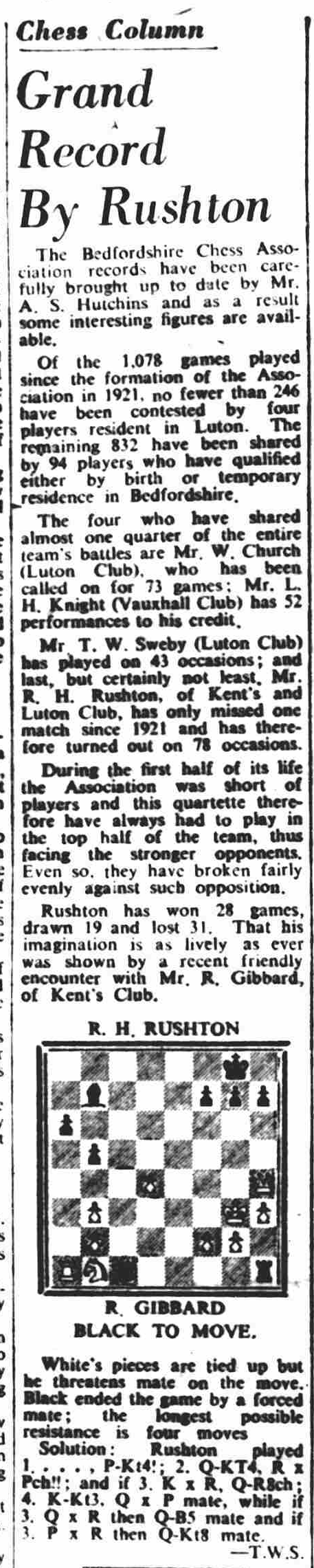 Tom Sweby, once described as a ‘tame communist by a former pupil who went on to put pen to paper also, is perhaps best known for his column in The Luton News, which ran for decades and was quite readable. That began in 67, but prior to that he also wrote for them and other newspapers on a freelance basis too. Not only that, he had a column in The Beds and Herts Pictorial which predated that in The Luton News. They are more or less the same and vary content both local and international, and both exude that lack of attention to detail he too frequently fell foul of. As far as I know, I am the only one who reproduces his columns and with this it is hoped that a greater appreciation and understanding of chess in the 50s in Bedfordshire will emerge. It must be said that chess wise the 50’s isn’t a decade which exemplifies strength and depth in Bedfordshire. This view is based on club and county results which were reported, the team members also indicate that the clubs in our league were not terribly strong back then.