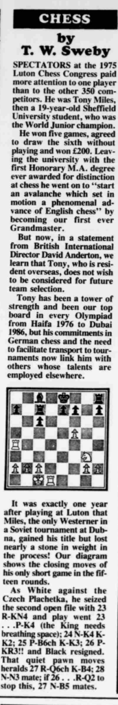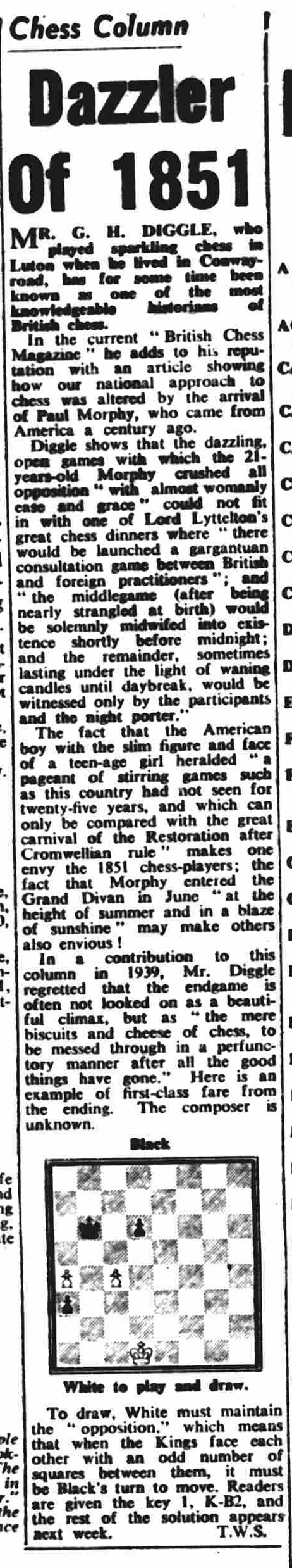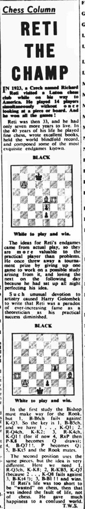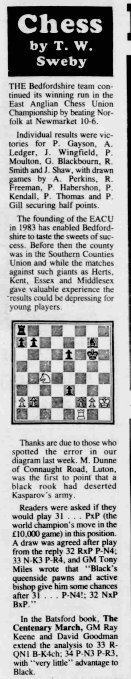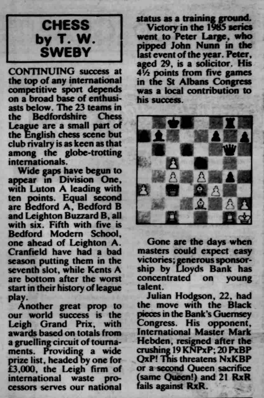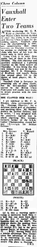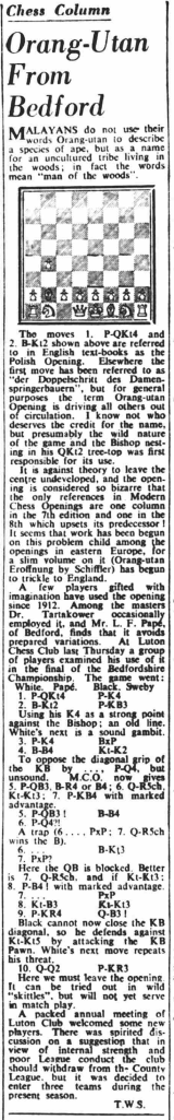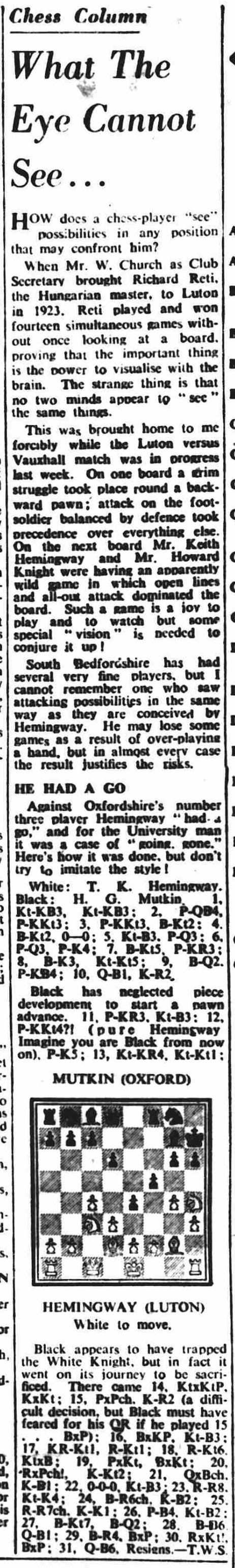 Tom Sweby, once described as a ‘tame communist by a former pupil who went on to put pen to paper also, is perhaps best known for his column in The Luton News, which ran for decades and was quite readable. That began in 67, but prior to that he also wrote for them and other newspapers on a freelance basis too. Not only that, he had a column in The Beds and Herts Pictorial which predated that in The Luton News. They are more or less the same and vary content both local and international, and both exude that lack of attention to detail he too frequently fell foul of. As far as I know, I am the only one who reproduces his columns and with this it is hoped that a greater appreciation and understanding of chess in the 50s in Bedfordshire will emerge. It must be said that chess wise the 50’s isn’t a decade which exemplifies strength and depth in Bedfordshire. This view is based on club and county results which were reported, the team members also indicate that the clubs in our league were not terribly strong back then.