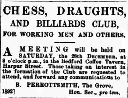 The reportage comes from The Bedford Record and is, of course, pre WW1 -something poet Philip Larkin has something to say about. A games night of billiards—-draughts—-chess. That’s got to be better than turning up just to play chess, surely? If not better than more wholesome. Just imagine it, a few pints as well, conversation and conviviality by the bar too, more games, more fun – a real night of it!
