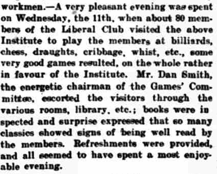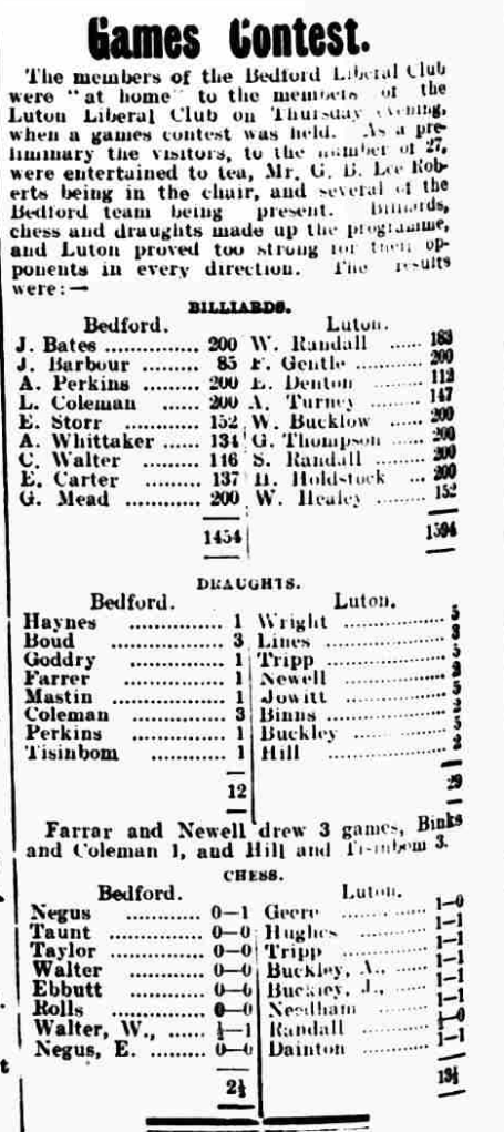 I have uncovered reportage which suggests our board game lovers from the past had a better time of things than what we do in modern times or at least a more wholesome experience. It should be noted that both clubs were classified as Liberal clubs but this should not be mistaken for political persuasion amongst of county fellows. Instead it most likely indicates that superior venues with better facilities were chosen over, say draughty church halls by we chess players wanting a game somewhere. In Bedfordshire during the 20th century there was a shift away from clubs with political affiliations towards working men’s clubs. And although working men’s clubs tended to signify a membership of employees from the designated company, that did not hold true for all members, and similarly, membership at clubs supporting political parties did not necessarily denote political persuasion but rather a liking for clubs with better facilities, frequented by friends and family most likely.