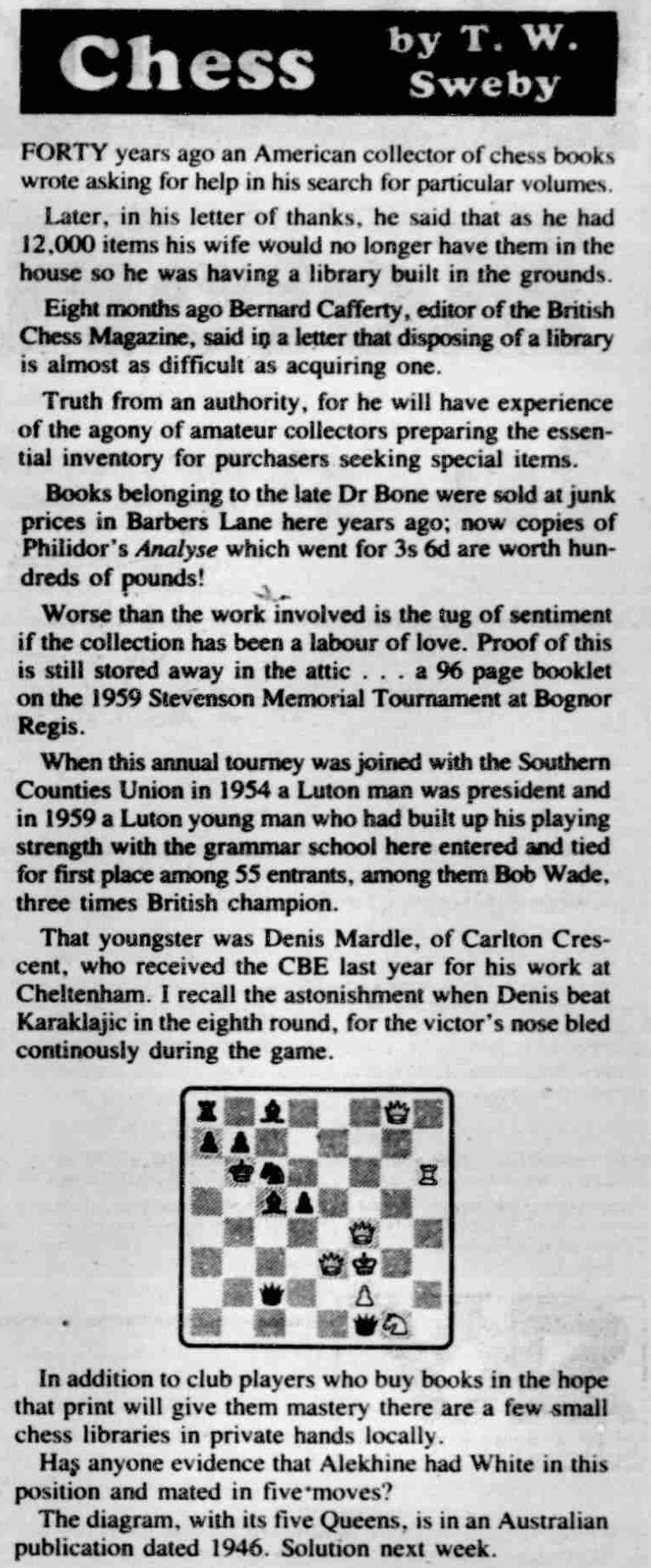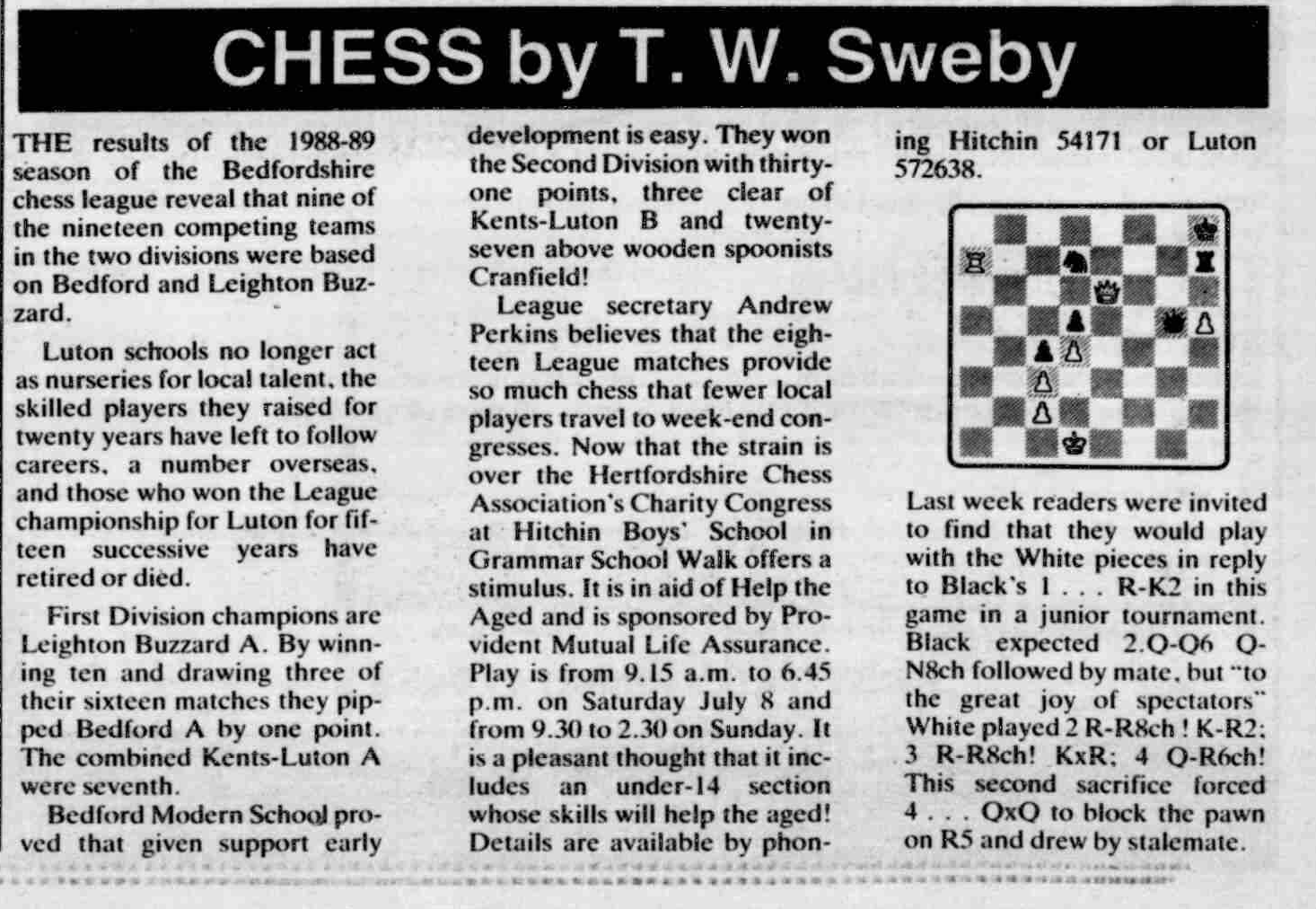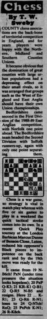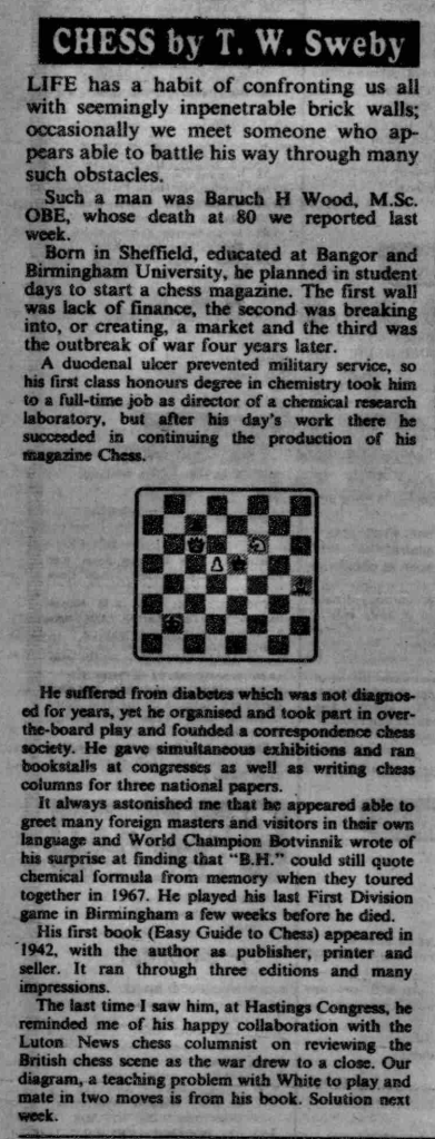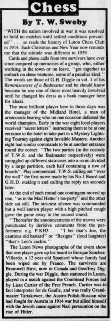 Fellow Bedfordshire league and county players, the book Chess in Bedfordshire (1933) was the first to gain a nationwide audience for chess in our county. The second author to achieve the same feat was G. H. Diggle, who wrote about his experiences of chess in Bedfordshire some decades later; therefore, he is a significant figure in our history. You will find his articles many times over by searching for him in the search bar, and wikipedia gives a fuller account of his achievements.