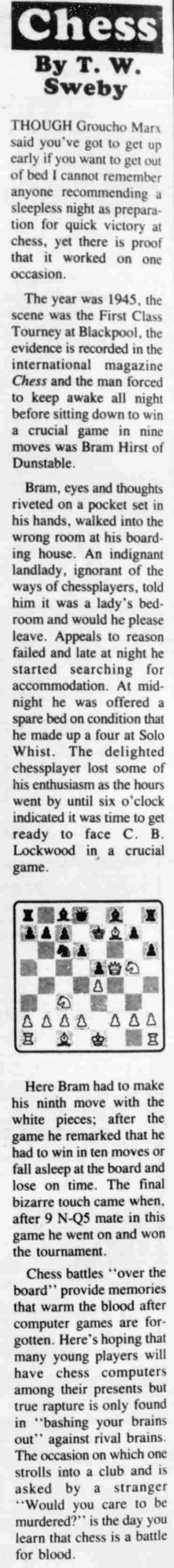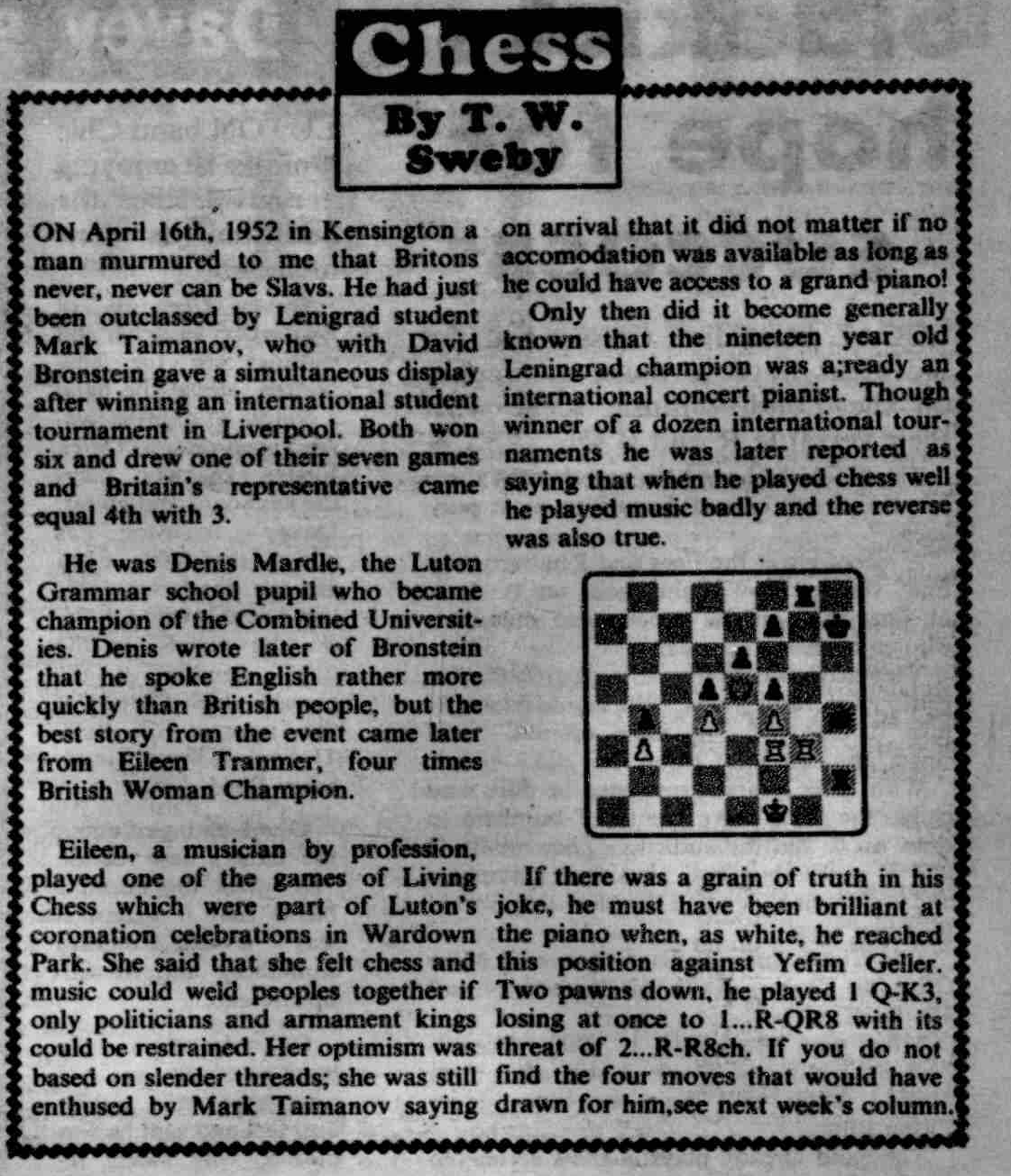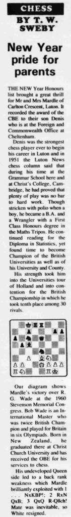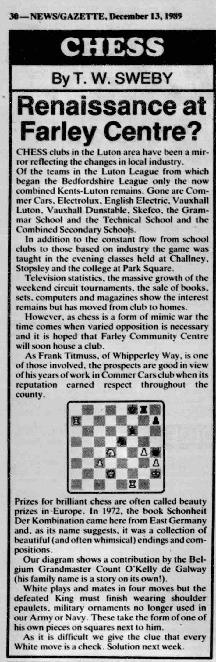 Fellow Bedfordshire league and county players, the book Chess in Bedfordshire (1933) was the first to gain a nationwide audience for chess in our county. The second author to achieve the same feat was G. H. Diggle, who wrote about his experiences of chess in Bedfordshire some decades later; therefore, he is a significant figure in our history. You will find his articles many times over by searching for him in the search bar, and wikipedia gives a fuller account of his achievements.