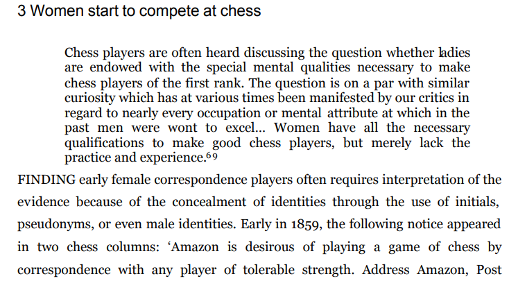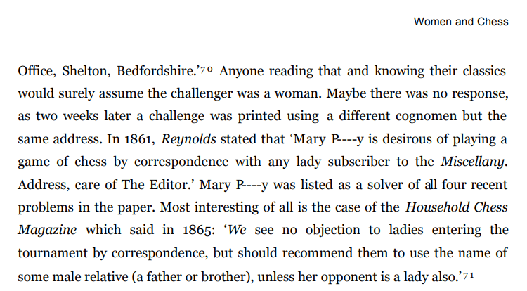 Victorian England is the context, the chapter pertaining, documenting some of the difficulties and challenges female players faced back then in much detail. Fellow county chess players, if you look through what has been posted on this site, you will note that, locally, women were never written about regarding chess in Bedfordshire, however, this does not mean that chess was not played by women in Bedfordshire but rather that it was more likely played at home rather than at a club as was commonplace back then, the author claims. The post-modern historian Jenkins once wrote in his publication Re-thinking history that ‘history and the past are categorically distinct’, herein lies evidence and argument to that effect. Put more simply, just because something has been left undocumented, it doesn’t mean it did not happen.