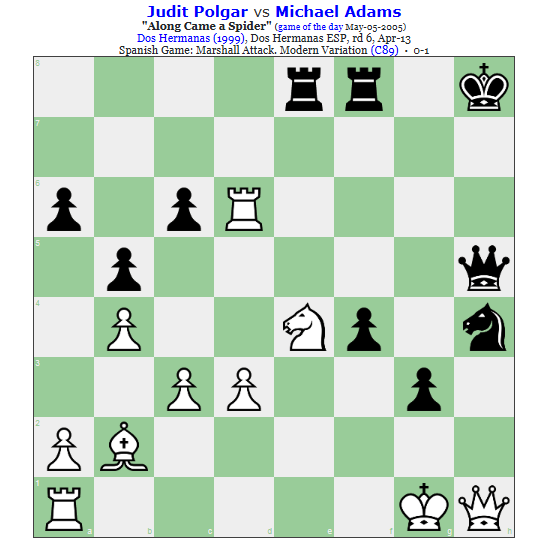 The game can be found here: https://www.chessgames.com/perl/chessgame?gid=1009910&comp=1. Far too above my level to follow. I do recall Adams was just about the best there was with the Marshall Gambit at his peak.