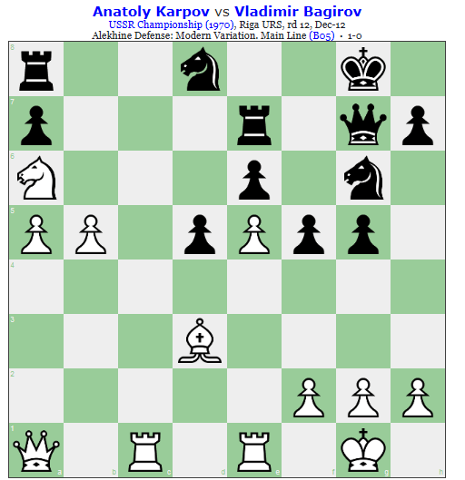 It’s in Karpov’s first publication of his games, although I have to say his analysis of it could have been more extensive. However, the depth of positional understanding in play by Karpov is so great, his opponent never stood a chance. Have a good look at 19. a3 if you don’t believe me. Play through it and ask yourself how an attack with a lone knight and a couple of pawns against 2 knights, 2 rooks, and a queen, as is the case after 37. Nc7 can succeed and why. That’s Karpov there or thereabouts at his best in my opinion. Poor old Bagairov.