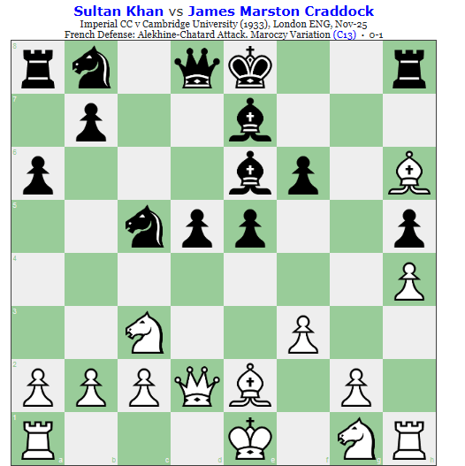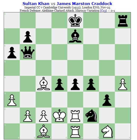 J. M. Craddock was British Boys (U-18) champion 1929-1931. I take particular interest in his games because for a while in the 50’s he lived in Dunstable and played for Bedfordshire. Here he dismantles British champion Mir Sultan Khan, who brought it on all himself in my opinion. The move below played by him is either extremely brave or downright foolhardy, one of the two -not a move I would dare play. Castling long, looks natural on one level as black has king safety issues, but that said, Khan is subject to an attack which he has no answer for, making castling long look premature perhaps?
