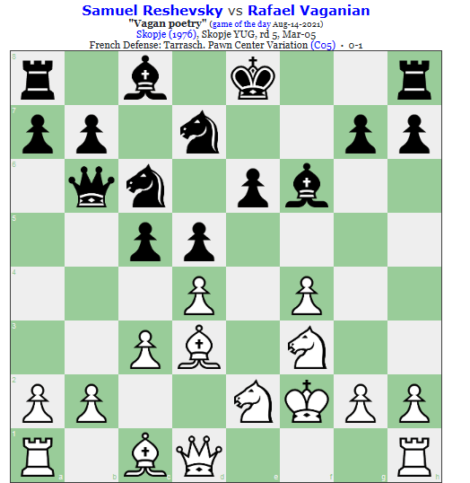 GM Reshevsky is the subject of my most treasured trivia question, that being ‘who is the only player to have played both Lasker and Karpov in classical chess?’ (factor in simuls and Botvinnink can be counted also), as no one ever knows the answer.