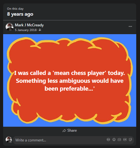 …I like to be both creative and amusing when I can be, factor in that playfulness has been an ever-present factor, the content of this site should be thought of as multifarious. It could be said I continue to enjoy undermining the conservatism I believe chess is underpinned by even after all these years, and often try to use humour to do it still, believing I have got better at it. Consequently, despite the general direction its going in, this site cannot only be about Chess in Bedfordshire and nor will it be. It may become noted for that yes -in fact that’s been the case for years already even by established historians, archivists, and whoever else. External factors aside, this site is titled McCreadyandChess. I cannot, nor will I not, remove my own personal thoughts and experiences of chess from the posts of this site -especially if I think they are funny or original for they constitute my writing at its very, very best. In addition, the number of categories alone tells you that breadth of content is important to me. I am proud of my site, it is identity conferring and that is how it shall stay -end of story. All you really have are: ‘Some thoughts on the beautiful game’, which, incidentally, just happen to be my very own; nothing more, nothing less, take of it whatever you please… .