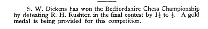 On Adrian Elwin’s site about Beds. chess, you may find a list of previous county champions here, Previous County Champions. Evidence that S. Dickens did indeed become county champion in 1928 is corroborated below.