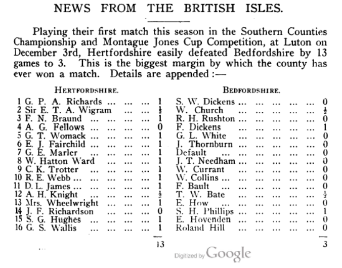 Some friends and former playing partners back home describe me as the ‘go to guy’ for the history of chess in Bedfordshire. This compliment says more about the lack of interest in the subject than my own endeavour. As mentioned, I am too adrift from academia to feel chuffed by it. Rather, I tend to lament that my historical research, like my chess, just isn’t what it should be. Even though I may well have a broad understanding of Bedfordshire chess history courtesy of the volume of research put into it, all of which began in 2014, this is not something I am particularly proud of. Nonetheless, out of courtesy compliments are graciously received. If the truth be told, I just see it as my job and only that – after all someone’s got to do it and no one else is that interested!