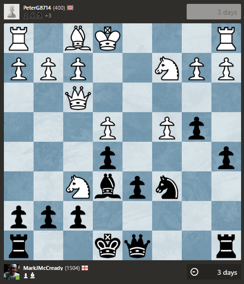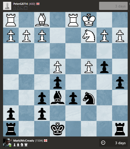 Much thought required here. Where does the king go? I don’t really want to place it on e7 if a knight can pop into d5. I have to keep my bishop on e6 and exchange off if that happens but if it does, I think my knight is slightly better than white’s bishop as it can stay unchallenged on d4. Do I castle queenside? My rook can gain counterplay on the a-file, do I want to take it off that file?