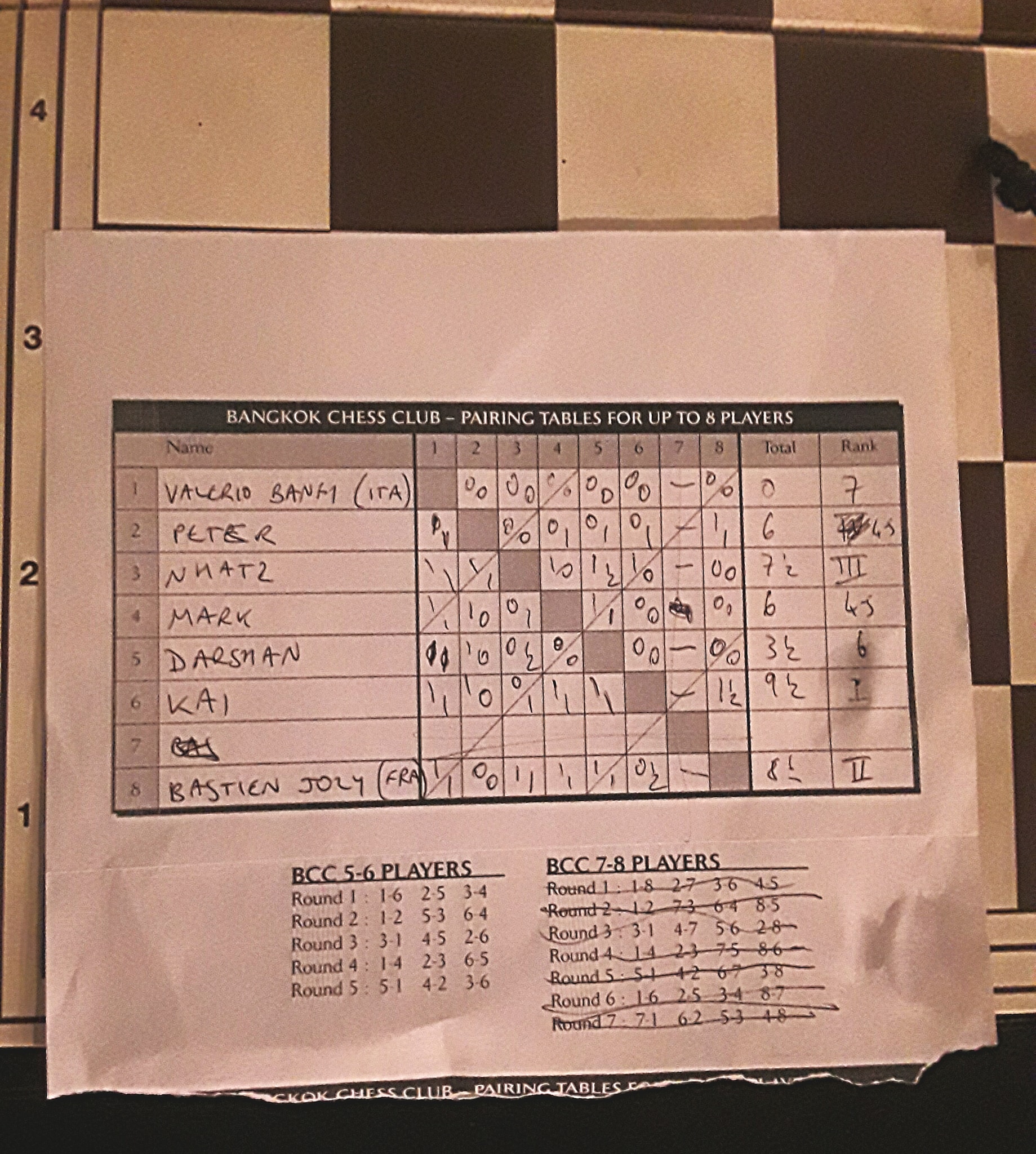 If anything, it has been a slow and gradual welcome return to the fold. In Bangkok for more than fifteen years to play chess now I have been, and make many friends along the way I did, most of whom are still here plying their trade OTB with a steady pint on hand by their board. Highlight of the week it is, play in the blitz tournaments I do always, even though play well I usually don’t. The topography of Bangkok Chess Club is a tough terrain, not just because the playing premises is subject to upheaval biennially…or thereabouts, but more so that several stalwarts aside you never do know who will turn up week to week. You don’t know how many also, with numbers varying between five to thirty usually. There’s a different bunch that make up the numbers as each week passes, predominantly ex-pats sometimes, predominantly local players sometimes, a mix of both usually. There’s a sense of continuity and impermanence stood side by side at Bangkok Chess Club, making each visit to the club both familiar and unpredictable. For me the overarching emotion in play is a sense of belonging. Neither a tourist nor resident, I am one who comes and goes, never staying for too long or too short a time. Not part of the furniture and not one of the passers by either, somewhere in between I am… .