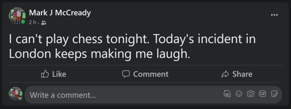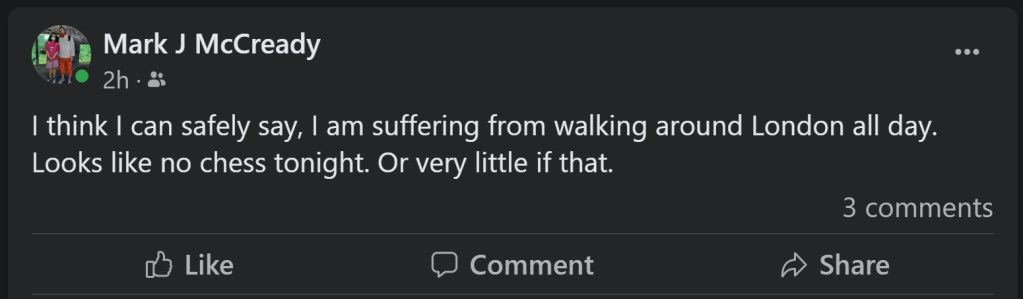 …I like to be both creative and amusing when I can be, factor in that playfulness has been an ever-present factor, the content of this site should be thought of as multifarious. It could be said I continue to enjoy undermining the conservatism I believe chess is underpinned by even after all these years, and often try to use humour to do it still, believing I have got better at it. Consequently, despite the general direction its going in, this site cannot only be about Chess in Bedfordshire and nor will it be. It may become noted for that yes -in fact that’s been the case for years already even by established historians, archivists, and whoever else. External factors aside, this site is titled McCreadyandChess. I cannot, nor will I not, remove my own personal thoughts and experiences of chess from the posts of this site -especially if I think they are funny or original for they constitute my writing at its very, very best. In addition, the number of categories alone tells you that breadth of content is important to me. I am proud of my site, it is identity conferring and that is how it shall stay -end of story. All you really have are: ‘Some thoughts on the beautiful game’, which, incidentally, just happen to be my very own; nothing more, nothing less, take of it whatever you please… .