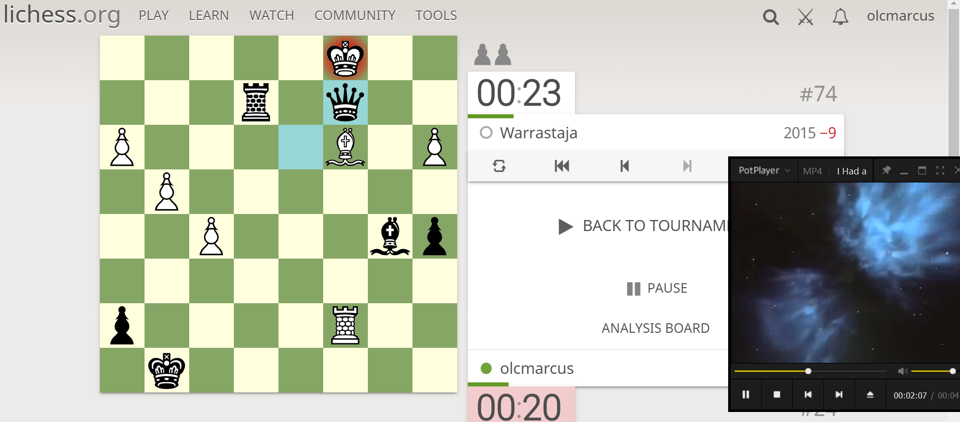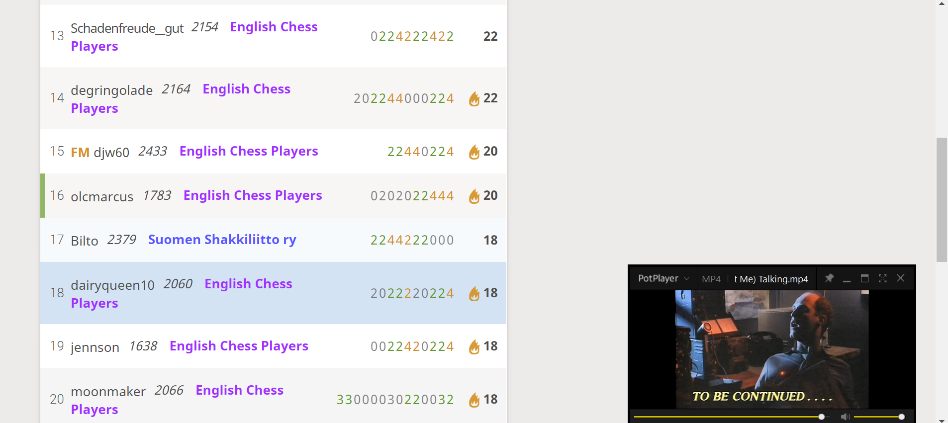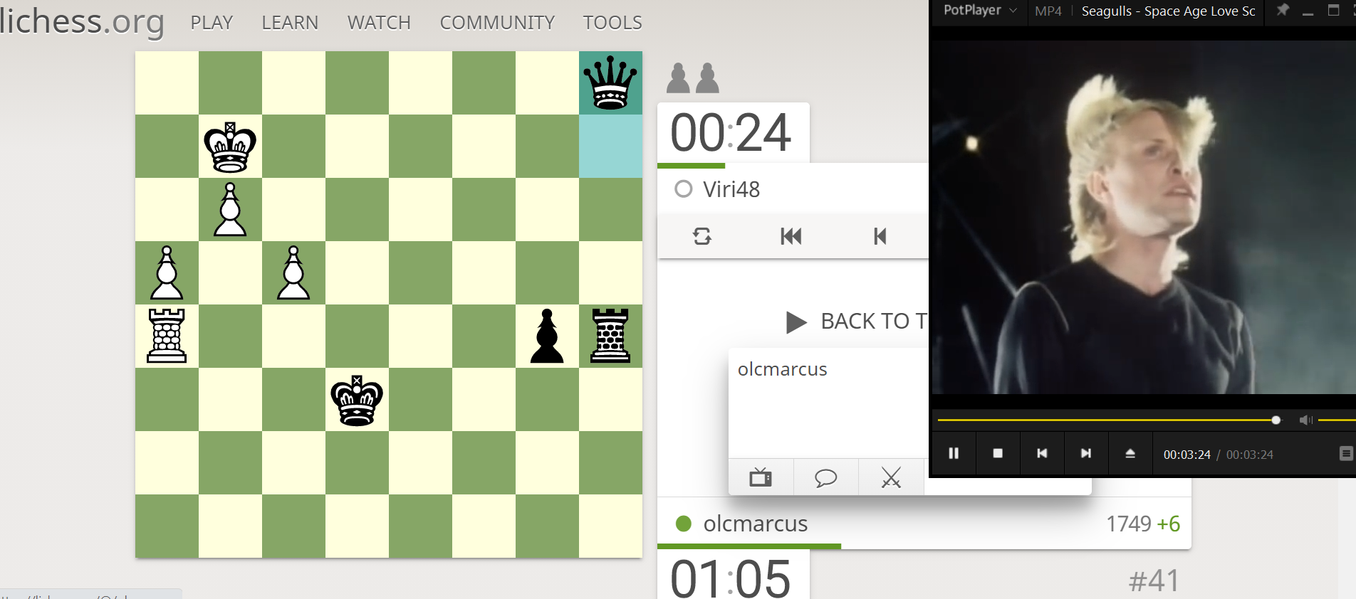 For the first time last night I represented England. A match against Finland was held. Of the 81 participants, around 30 were titled, of course there were Grandmasters playing. The time frame was 1h 20m, games were set at 3m, 2s increment. I won almost every game I played, held firm in joint 11th for the most part then slipped up in my final game to someone rated 2227. I finished 16th out of 81 even though those finishing both above and below me were on average 300-500 points above me. I punched well above my weight and feel proud of myself for stepping up to the mark against very strong opposition. England gave Finland a sound beating and I did my country proud by sticking in earbuds and bopping away with my favourite 80’s band (A Flock of Seagulls) as I blitzed my way up the leaderboard. All music video images in the screenshots below are of A Flock of Seagulls, the first one being from the song ‘The More you Live The More you Love’. I don’t know about you but the more I live the more I love playing chess.