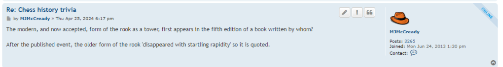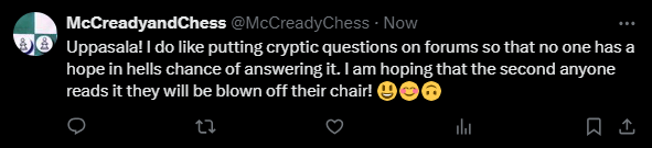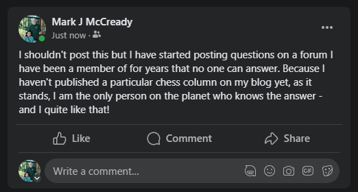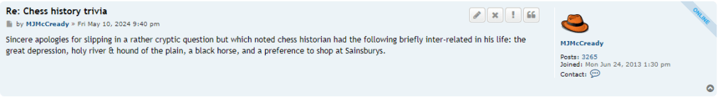 As the years have gone by, I have become increasingly ambivalent towards the English Chess Forum due to its conservatism, which is the thing I dislike the most in the chess world. Nonetheless, it does contain professional players, many knowledgeable souls and some established historians too. There is a chess history trivia section of which I am a contributor and recently I have started upping the ante, asking difficult questions which no one can answer. Now I’ve gone a bit cryptic and deliberately asked a question that only I on this planet can answer (the key to it lies in a column I have not yet published on my site)! Not only that, no one is likely to attempt it either, and that includes the most senior chess historians in the world even though they are actually familiar with the person who is the answer. It is worded in such a way, no one is going to get it. Or has McCready got it all wrong and is going to be shot down in flames? Is this nothing more than some sort of Killing Joke? Want to see what it is?