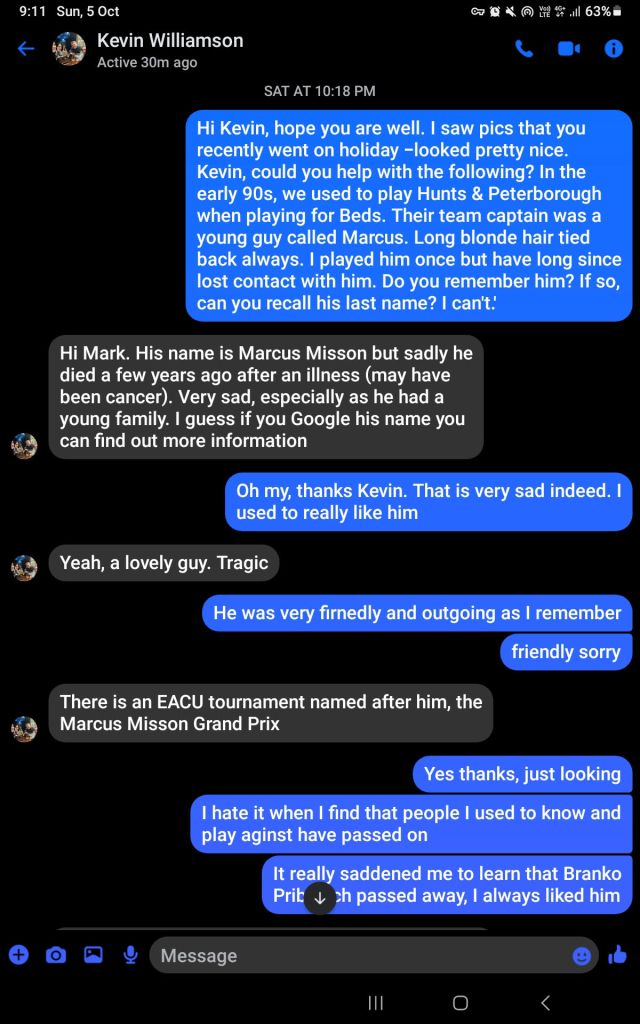 It’s also commonplace to like someone who shares the same interests as you, especially when you both dress the same way, have a similar background, have the same initials even, and you find them uplifting. This was true of Marcus Misson, who used to captain the Hunts & Peterborough county team in the 90s in the EACU. I took a liking to him for many reasons. Nowadays, I am mostly known as Marcus even though this is not my actual name (Mark is), although I should add this is only so informally, mostly amongst friends and colleagues. Many do like to change their name but he is the original inspiration behind that little namesake shift of mine, partially successful in reducing self-loathing some! 1 He used to have long hair tied back, as I did, he was my age also and a super-friendly guy. Working class like me and very extrovert -not at all your archetypal chess player. He always seemed to have a smile on his face and I liked how organized he was. Whenever I had the opportunity to chat to him I did for he had such great interest in everything and was very approachable. Because of this I looked up to him – as the county team captain- and often watched how he went about things with some admiration – as you do when you like someone, for example -how he would fill in results on the team sheets whilst on the go by standing and leaning on doors or walls for support whilst scribbling and chatting away quietly to team-mates unfussed by anything.