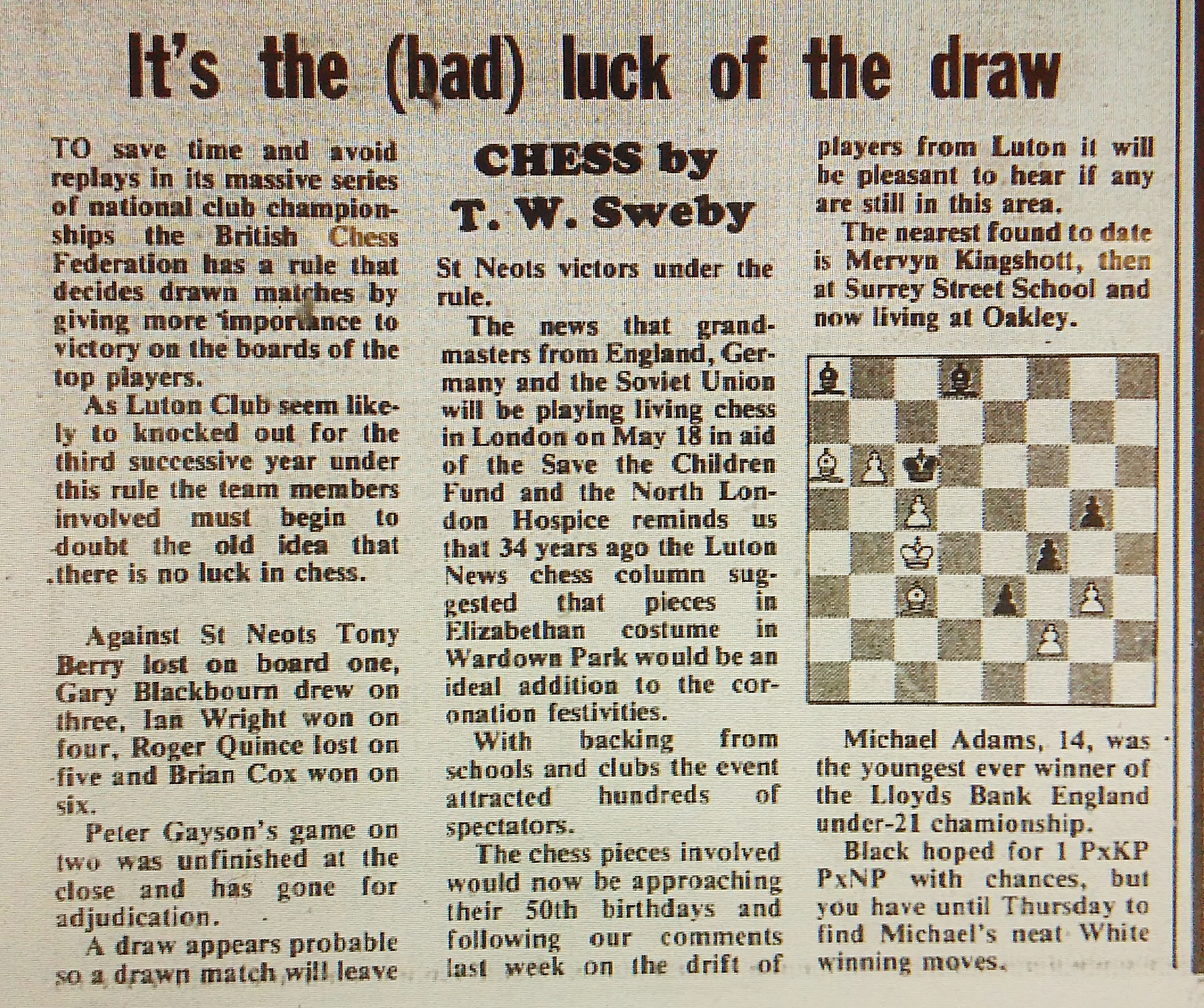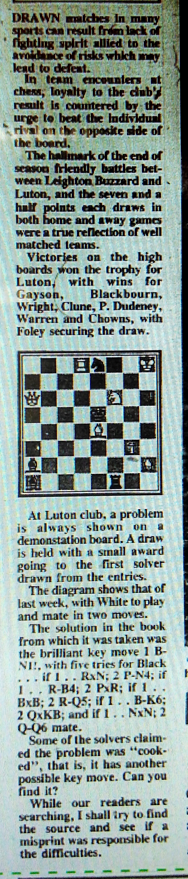 The following post is, primarily, an exposition of material selected from The Luton News Archives, which are kept on microfilm in Luton Central Library (and I apologize in advance if some content is a little difficult to read, the transition from film to paper via digital scanner, to photocopier then a lossy JPEG via a second digital scanner to this site via a crude upload tool has, unsurprisingly, compromised some excerpts, please click on those especially at the beginning of the post for a better view). Its main purpose is to offer an account of the change that chess in Bedfordshire underwent during the 70s, and since history doesn’t offer us neat end points, the decades before and after it too. The topic of the post is local chess history; it has a narrow focus and is for those with an interest in Bedfordshire chess, readers with a more casual interest in the topic are, of course, more than welcome to read on.