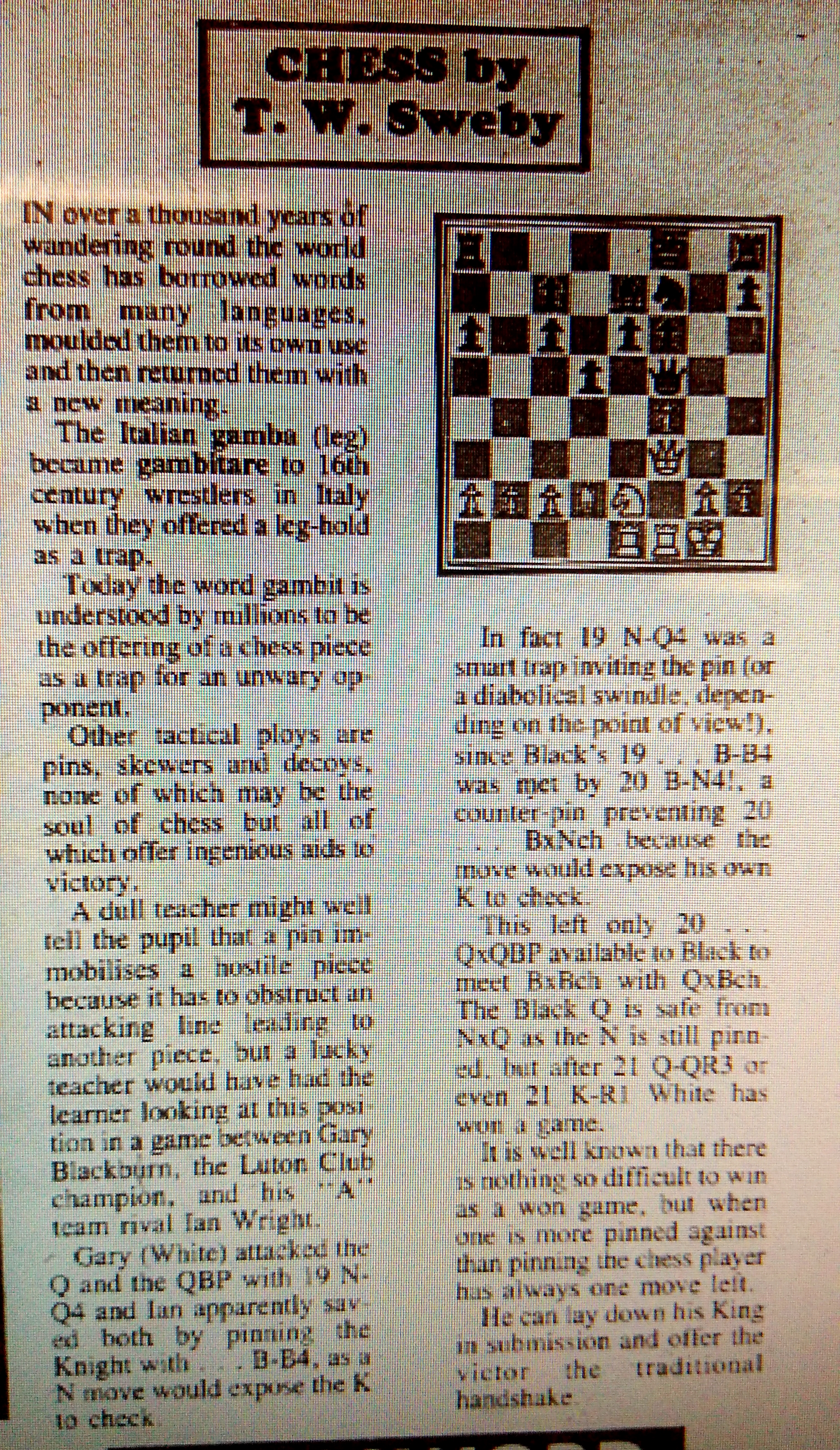 In the following columns a veritable deluge of school chess action in Luton can be seen, with almost every high school in town participating in the Luton Schools Chess League, strong-armed by Sweby himself. In the first, Parry demonstrates at junior county level his chess prowess once more.