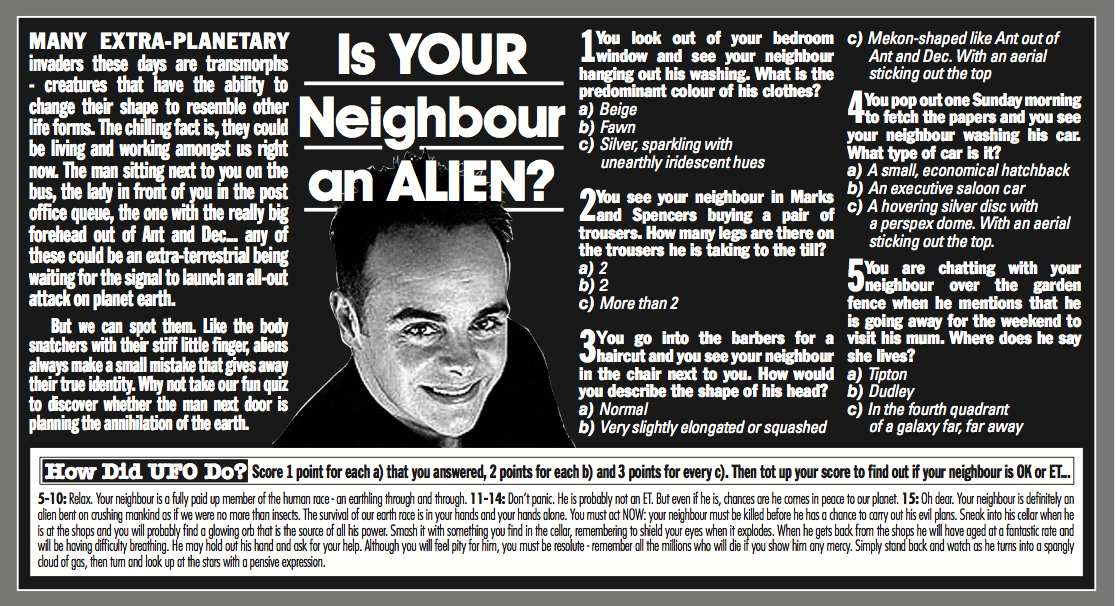But we can spot them. Like the body snatchers with their stiff little finger, aliens always make a small mistake that reveals their true identity. Why not take my fun quiz to discover whether your team captain is planning an annihilation of the earth instead of how to win the league?